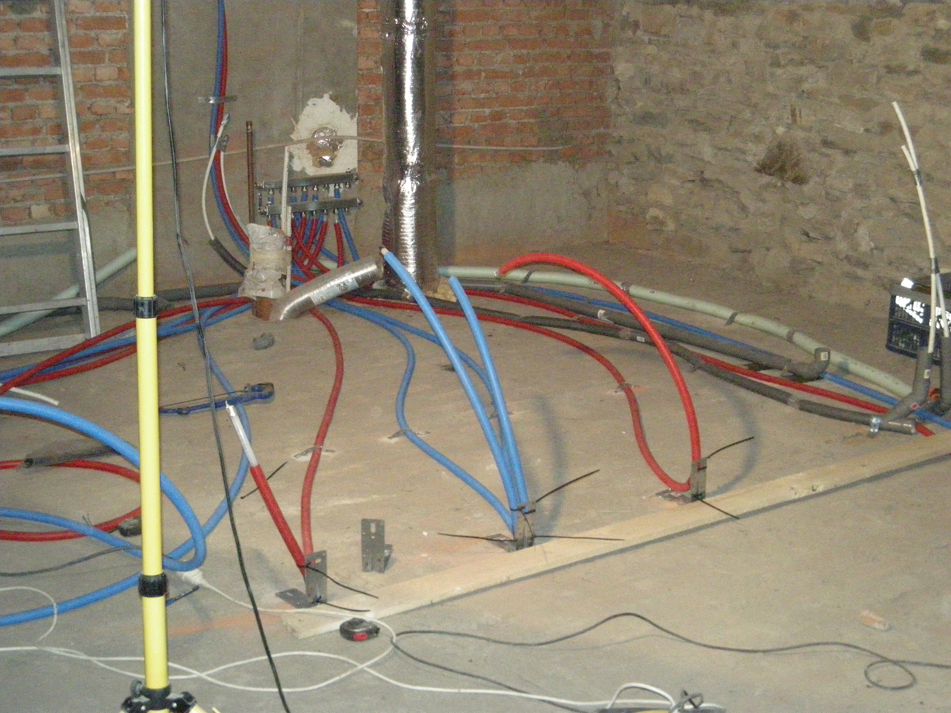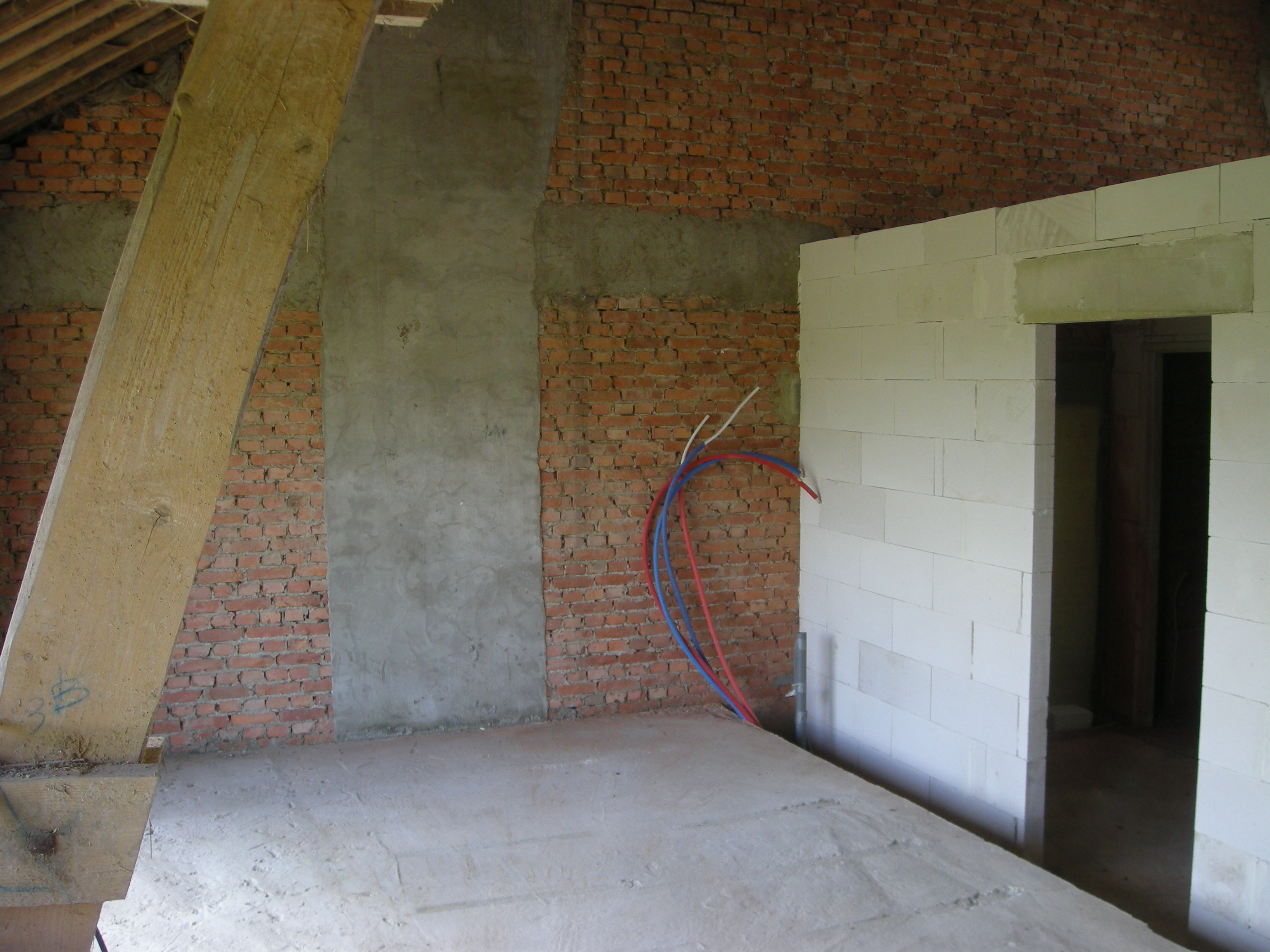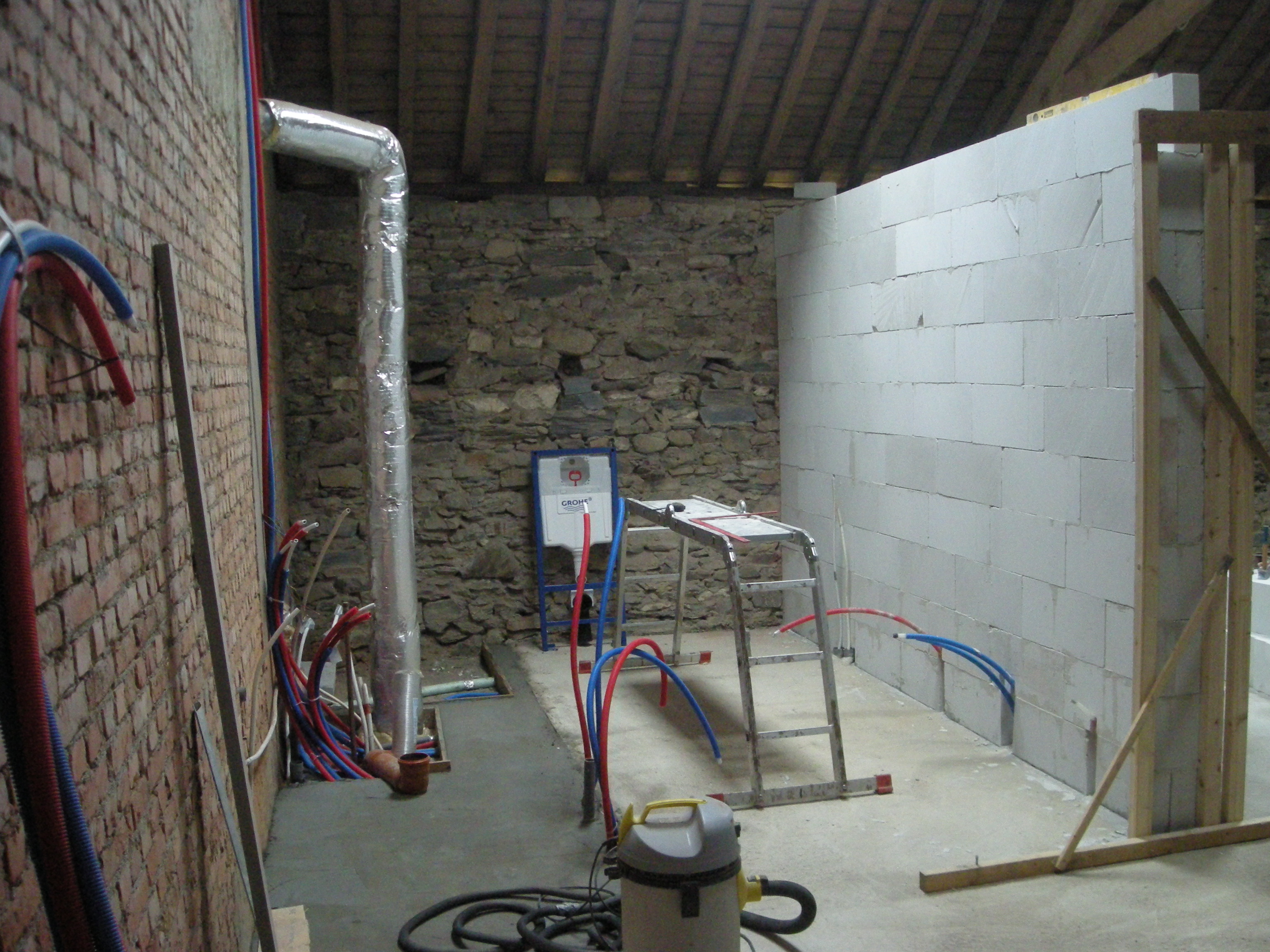 In het voorjaar van 2010 toen het schuurtje grotendeels klaar was konden we aan de hooizolder beginnen. Tony Renard was in de stal begonnen met het verwijderen van de oude vloer en het maken van een nieuwe betonvloer. Op de zolder stonden er drie slaapkamers, twee badkamers, een toilet en een berging op het programma. Als eerste moest een fors aantal slangen voor water en verwarming worden gelegd en uiteraard ook afvoeren voor lucht en water. Tony heeft er vervolgens een betonvloertje over heen gelegd.