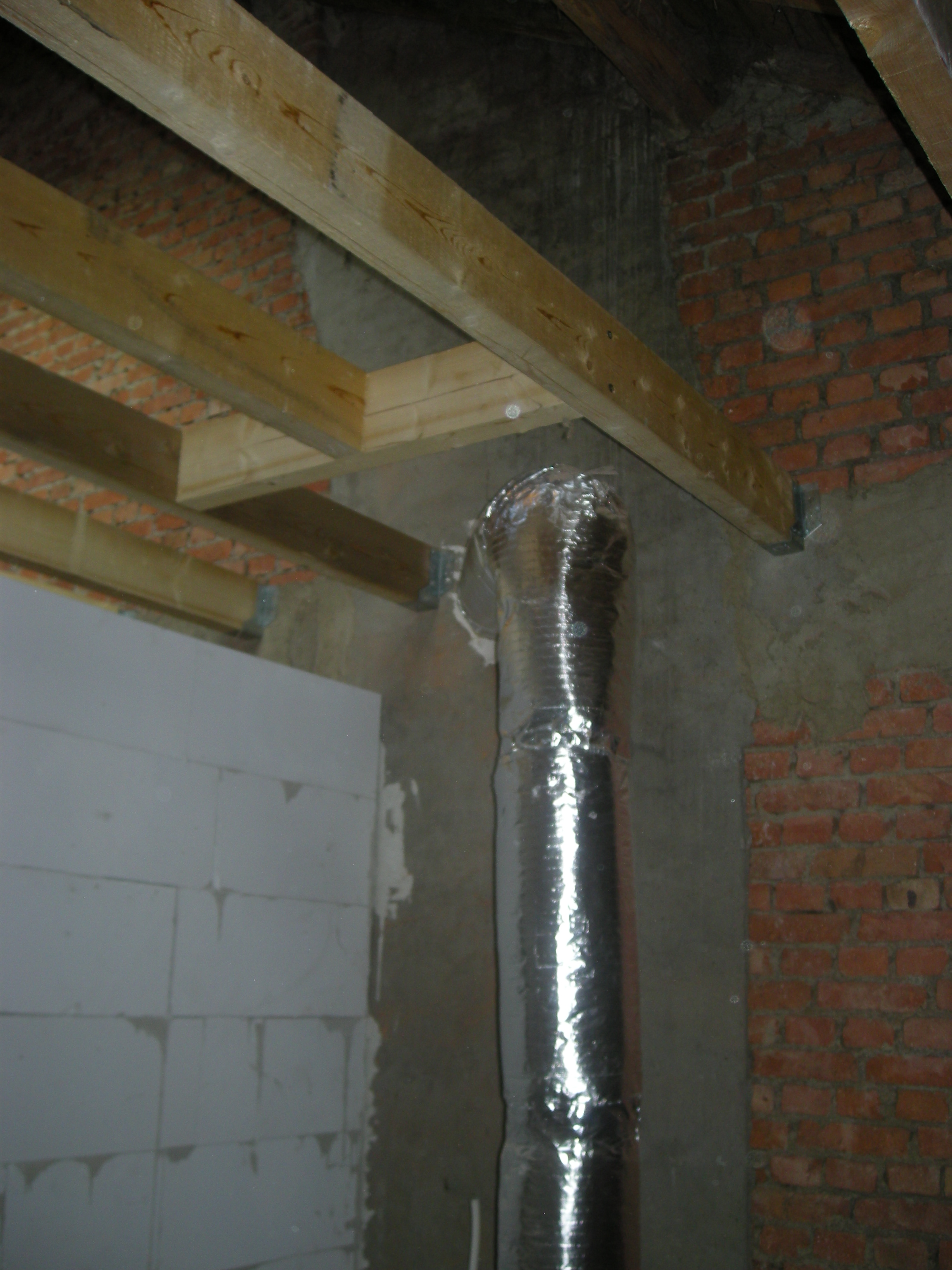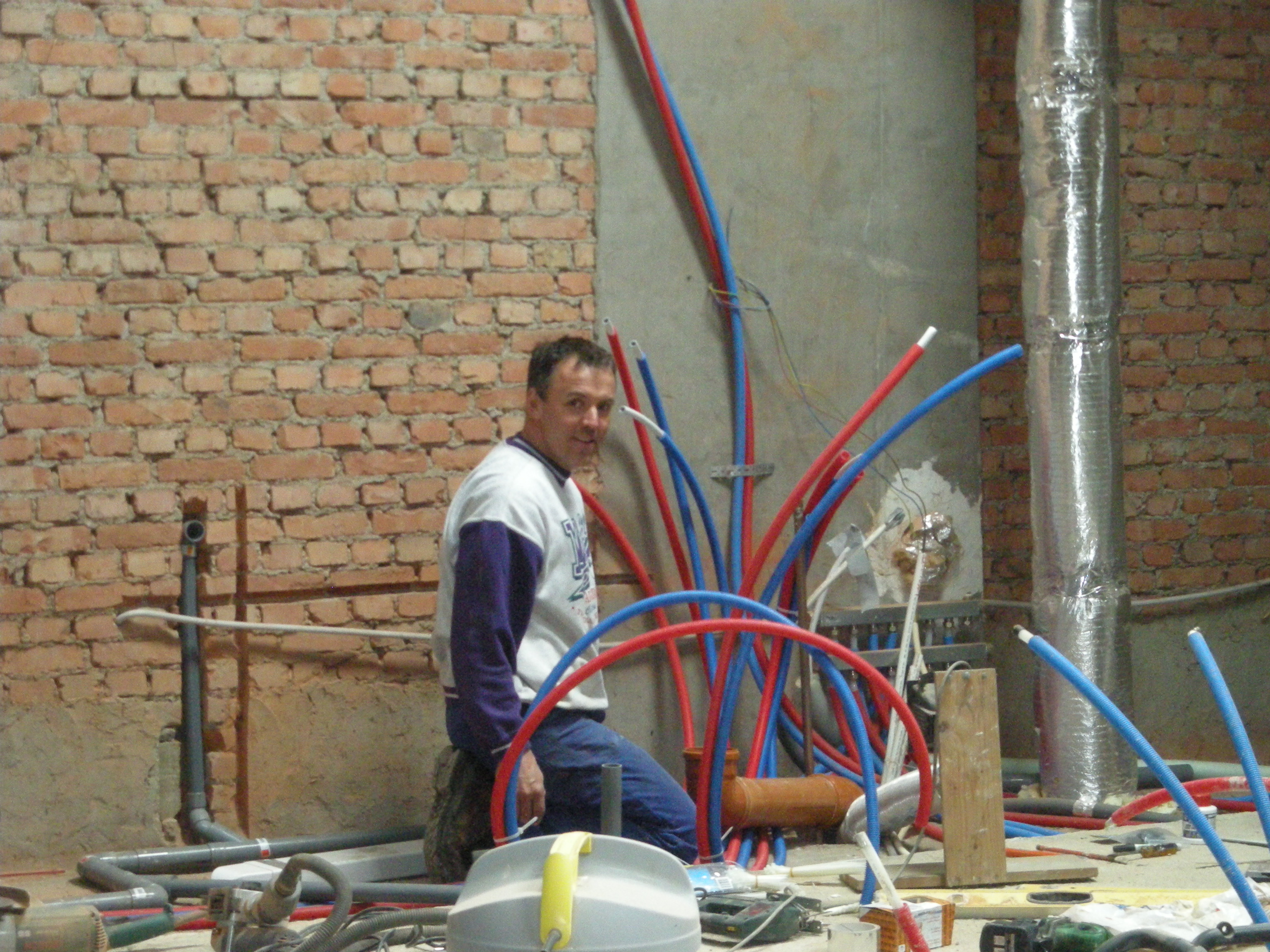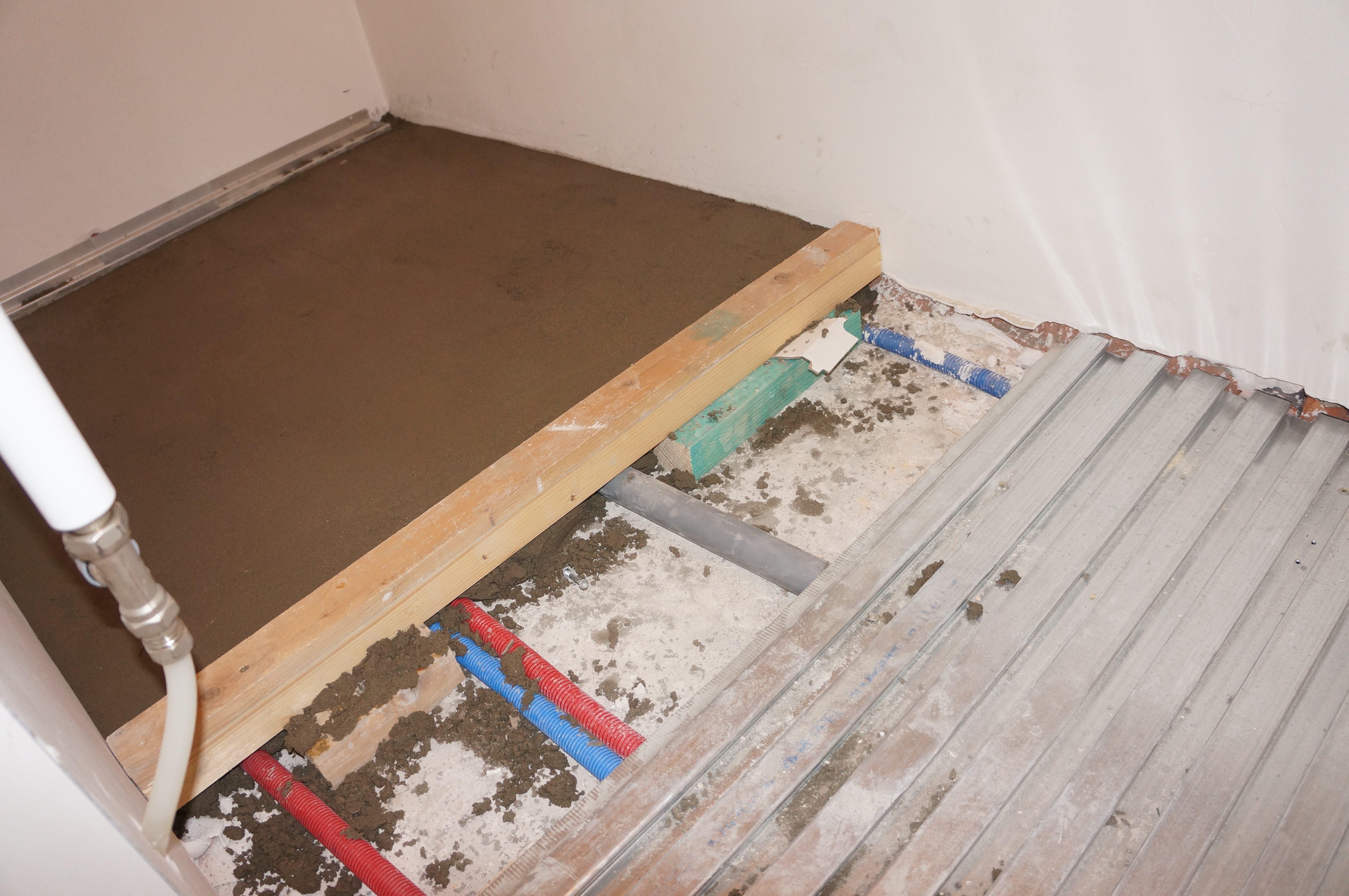 In het voorjaar van 2010 toen het schuurtje grotendeels klaar was konden we aan de hooizolder beginnen. Tony Renard was in de stal begonnen met het verwijderen van de oude vloer en het maken van een nieuwe betonvloer. Op de zolder stonden er drie slaapkamers, twee badkamers, een toilet en een berging op het programma. Als eerste moest een fors aantal slangen voor water en verwarming worden gelegd en uiteraard ook afvoeren voor lucht en water. Tony heeft er vervolgens een betonvloertje over heen gelegd.