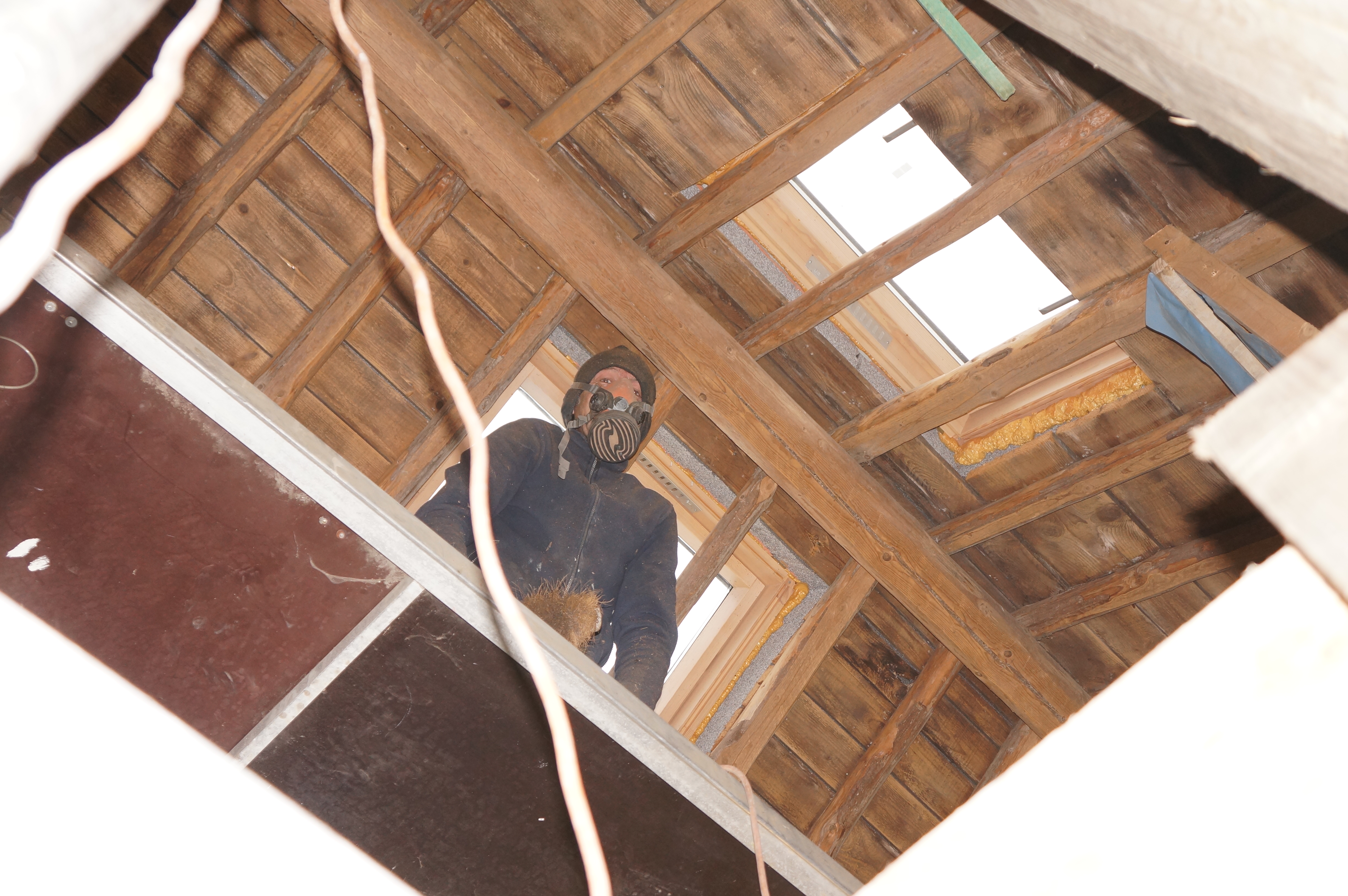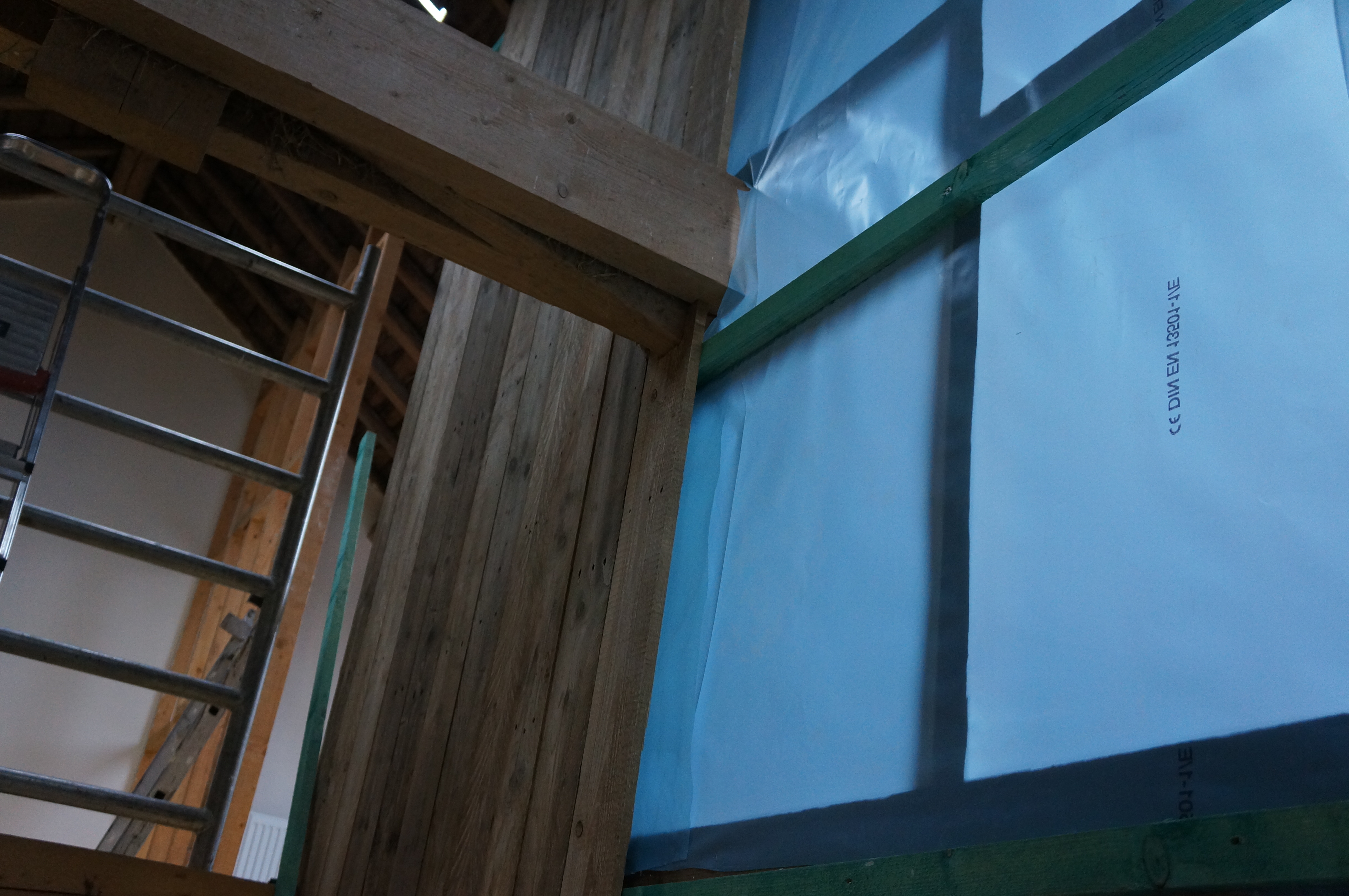 In december 2012 zijn we begonnen aan de aftimmering. In Roosendaal had ik via Marktplaats een leverancier van sloophout gevonden. Hij had een grote partij planken in de aanbieding, afkomstig van oude cementpallets. De planken waren behoorlijk vies en ruw en moesten dus eerst geschuurd worden. Mariette heeft twee dagen achter elkaar vrijwel niks anders gedaan maar toen waren de planken goed bruikbaar. Hans hielp mee de planken met veel geduld op maat te maken en vast te timmeren. Ook het oude dakbeschot werd door hem schoongemaakt en schuurde hij weer netjes op. Ongelooflijk wat een resultaat je met oud hout kunt bereiken!