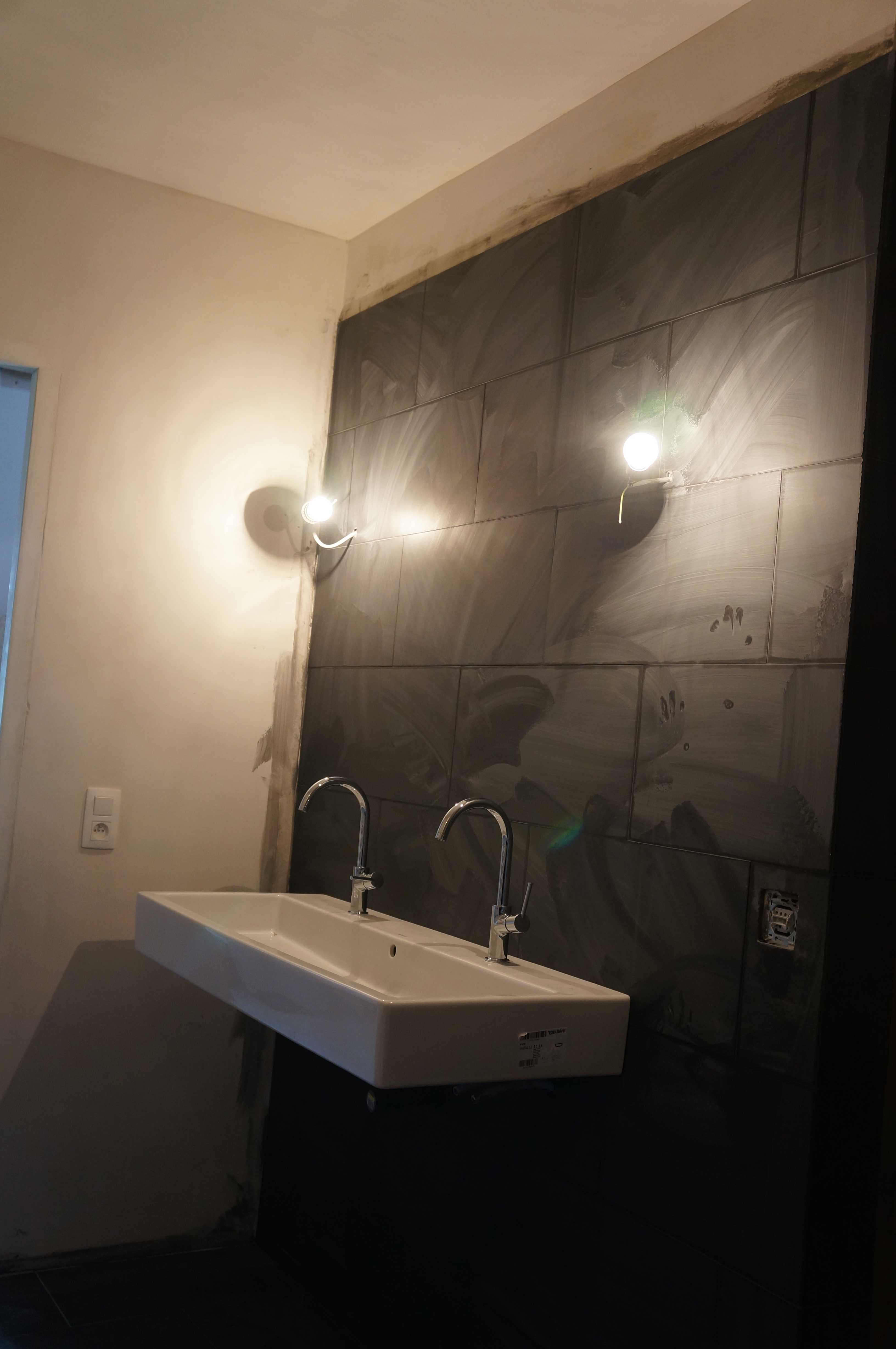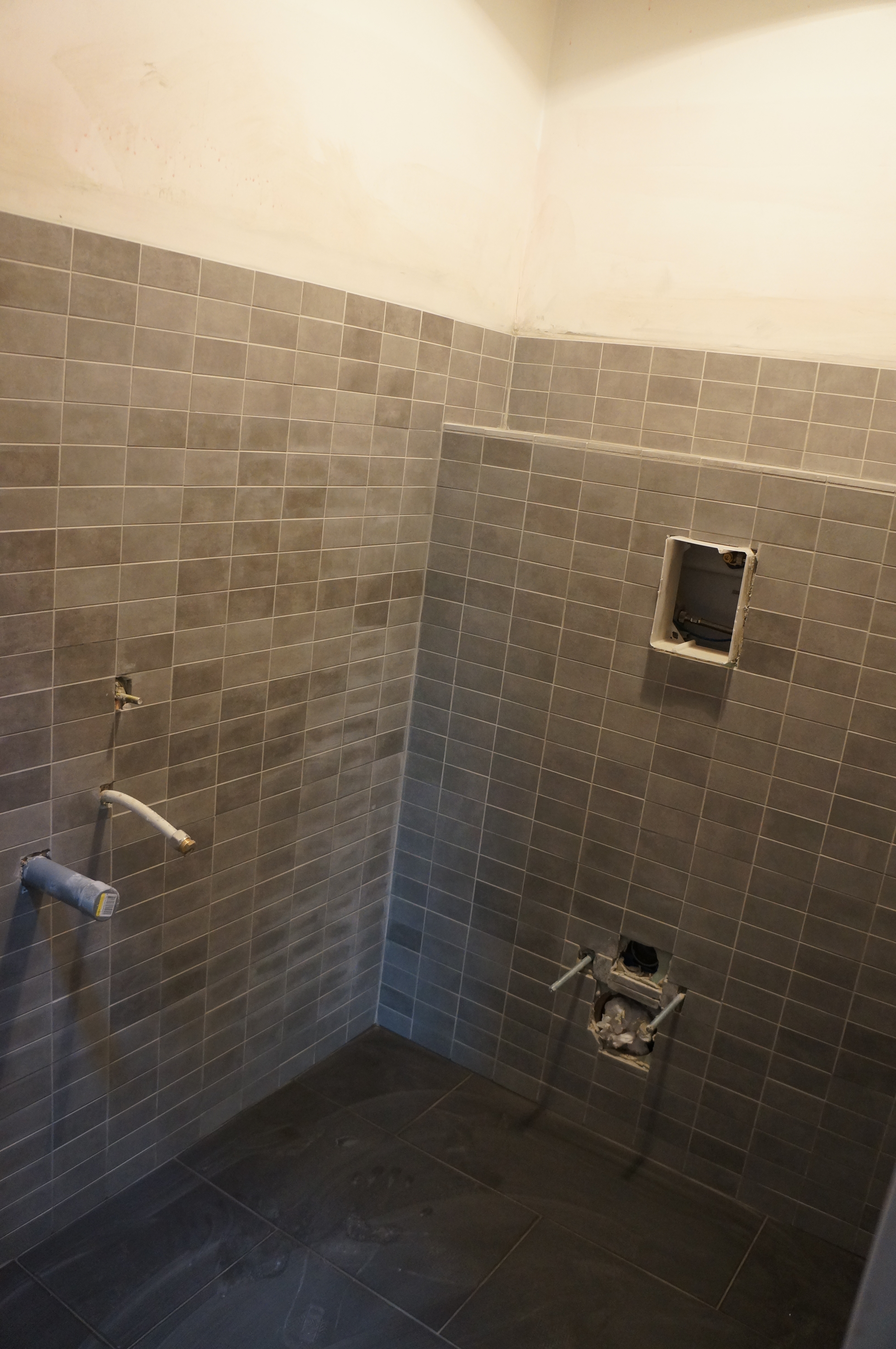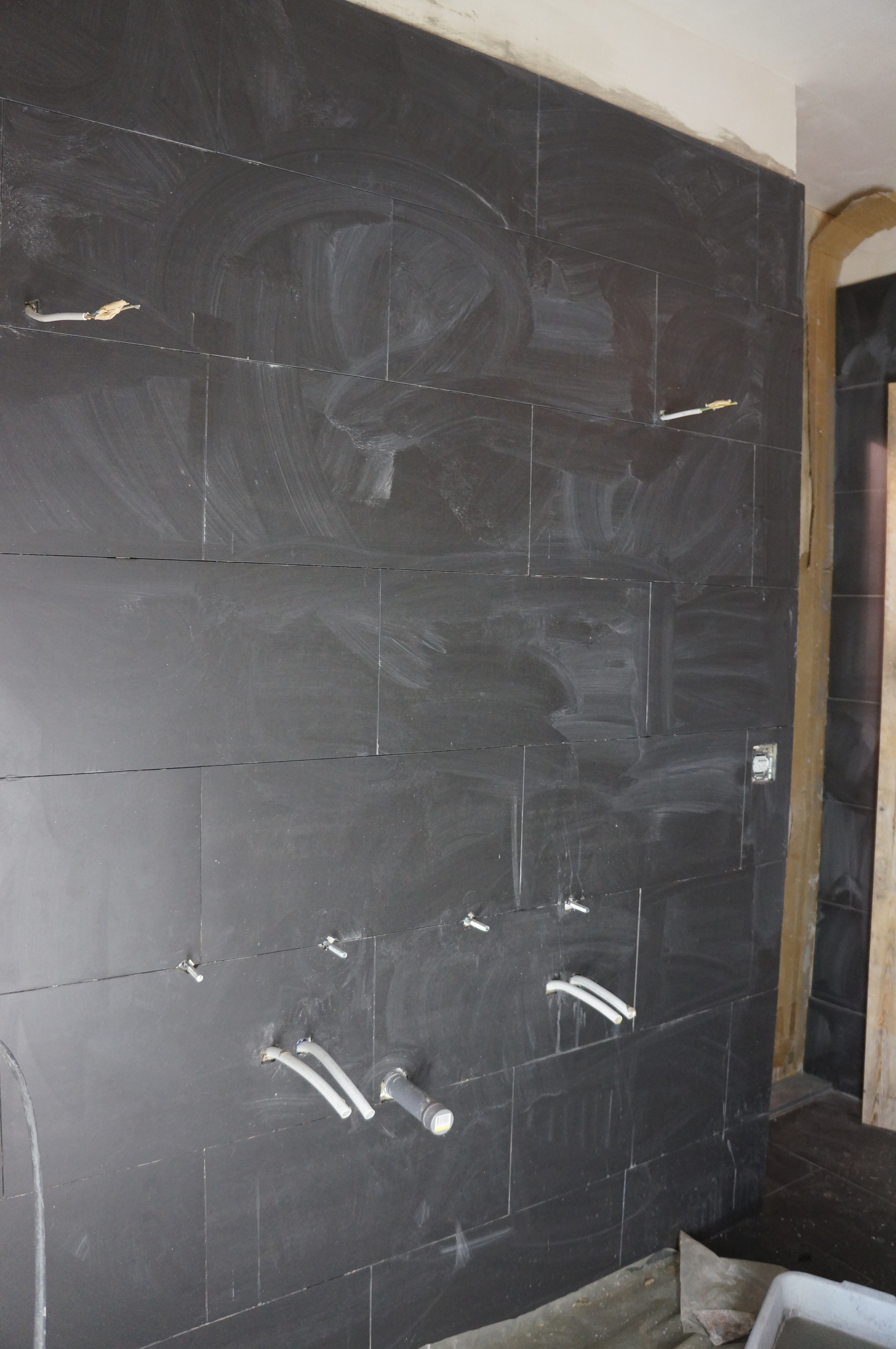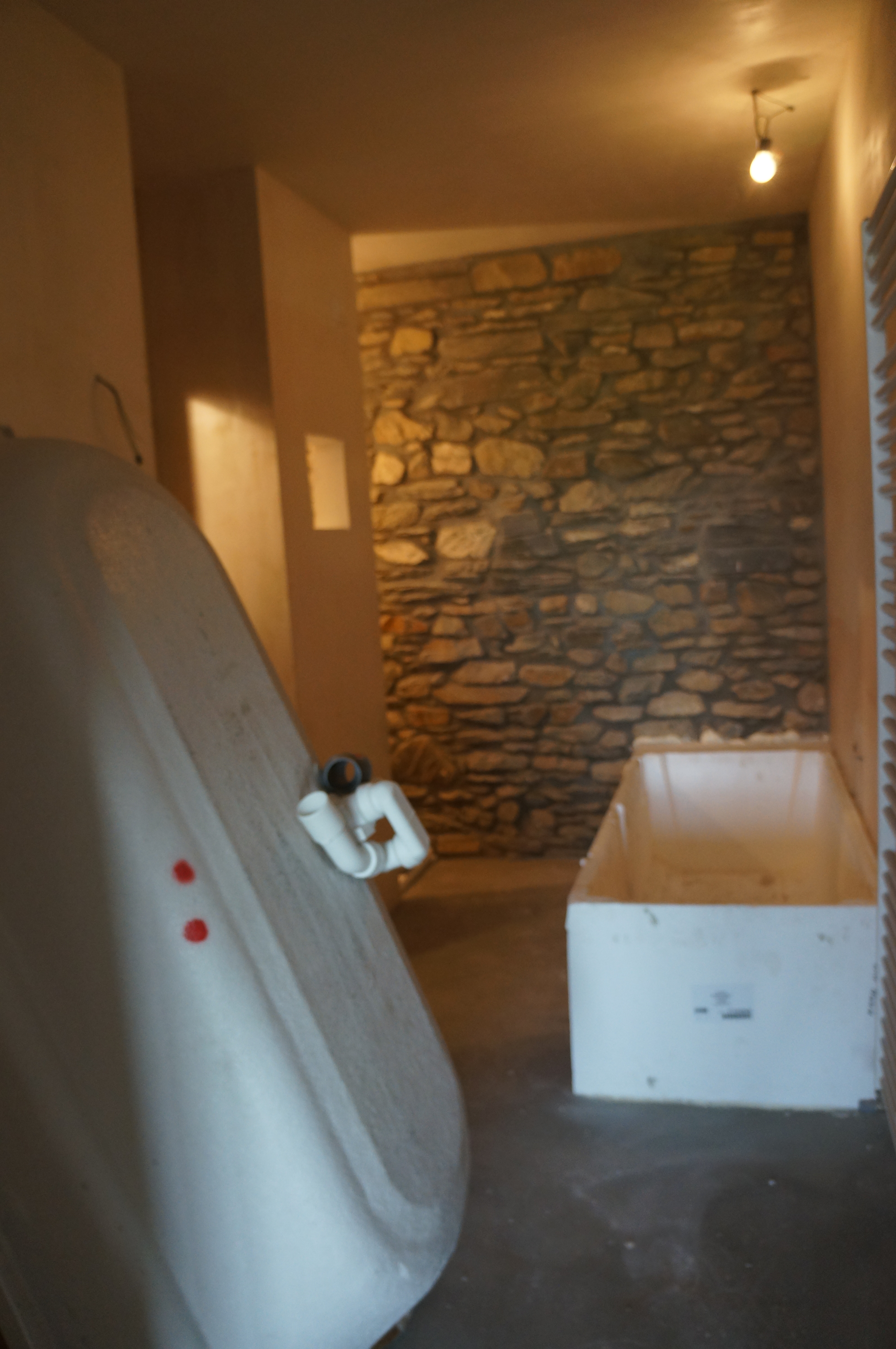 Heerlijk gevoel als de ruimtes zo een voor een af komen. Nu de grootste klus: de badkamer. Eerst moesten nog een hoop leidingen op maat gemaakt worden en in de muren weggwerkt, luchtafvoeren aangebracht, deur voor de ‘technical room’ etc. Het bad werd in een piepschuimen vorm geplaatst die direct betegeld kan worden. Na een laatste laag egaline konden eindelijk de tegels erin. Eerst de douche en toen de badkamer zelf.