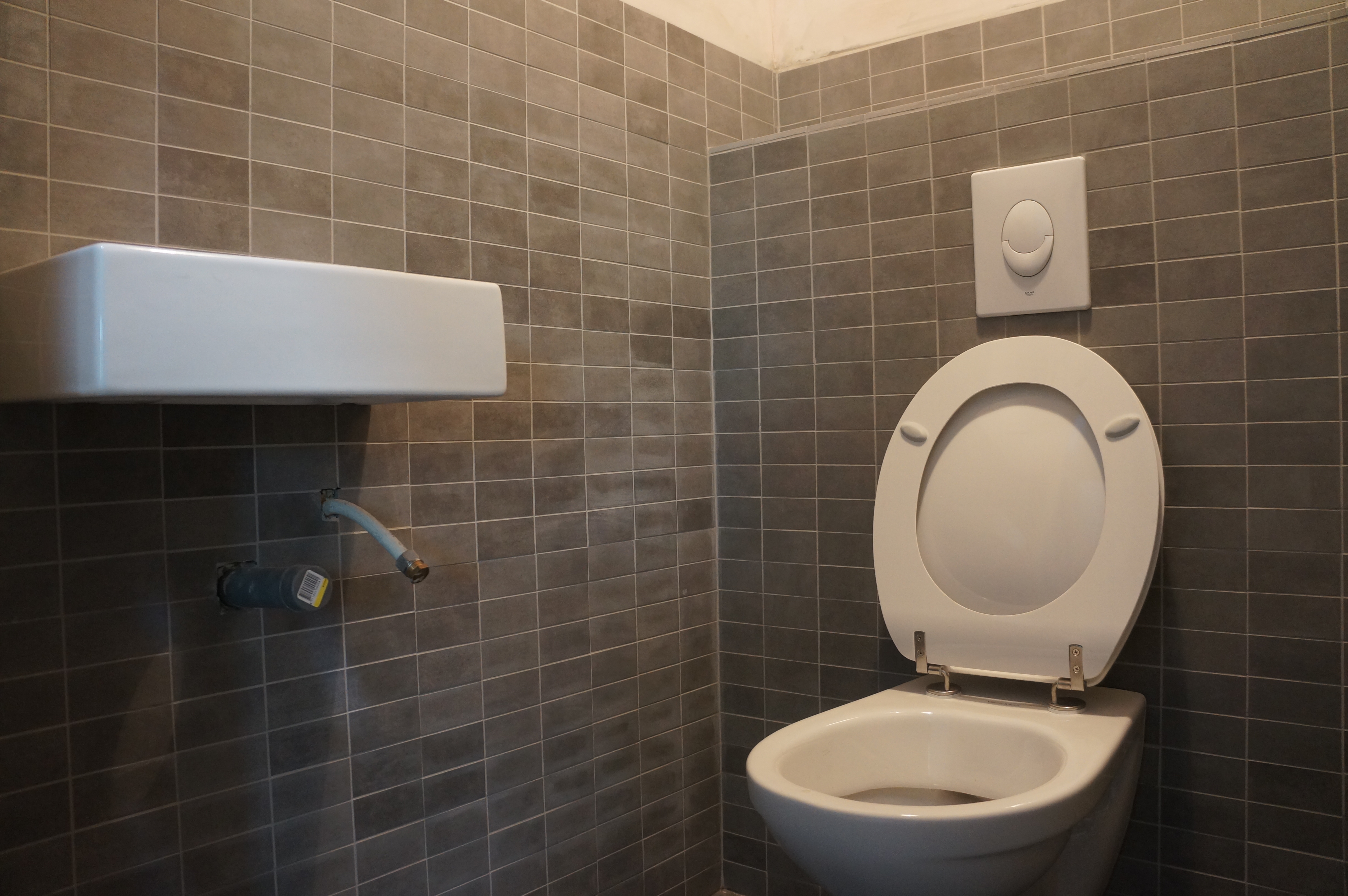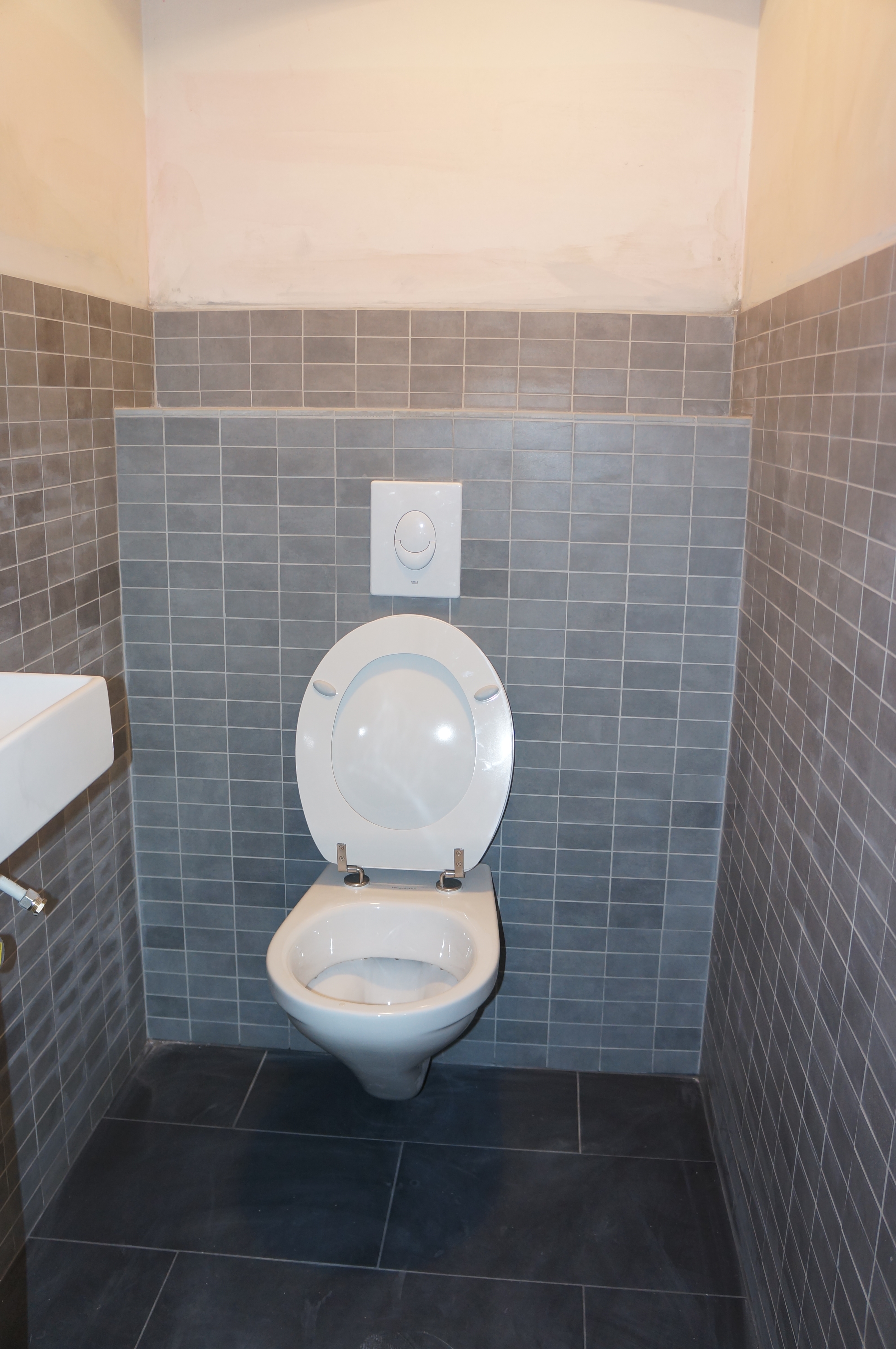 Na deze major ‘home improvement’ konden we eindelijk aan het tegelwerk beginnen. Eerst maar de WC om een beetje warm te draaien. De grote tegels gingen met de nieuwe tegelzaag heel vlot, de kleine tegels was meer gepruts, vooral het voegen blijft een klus.