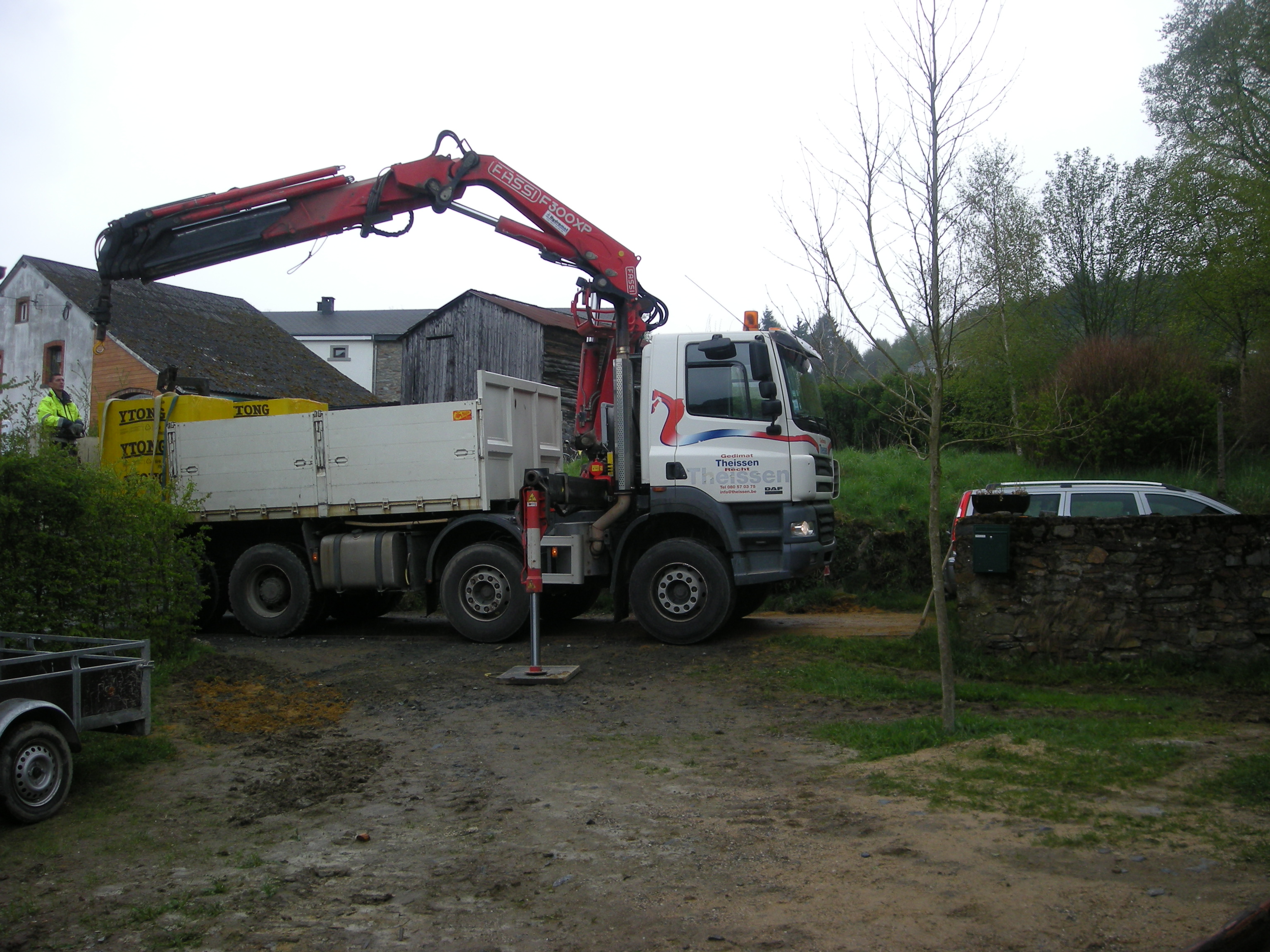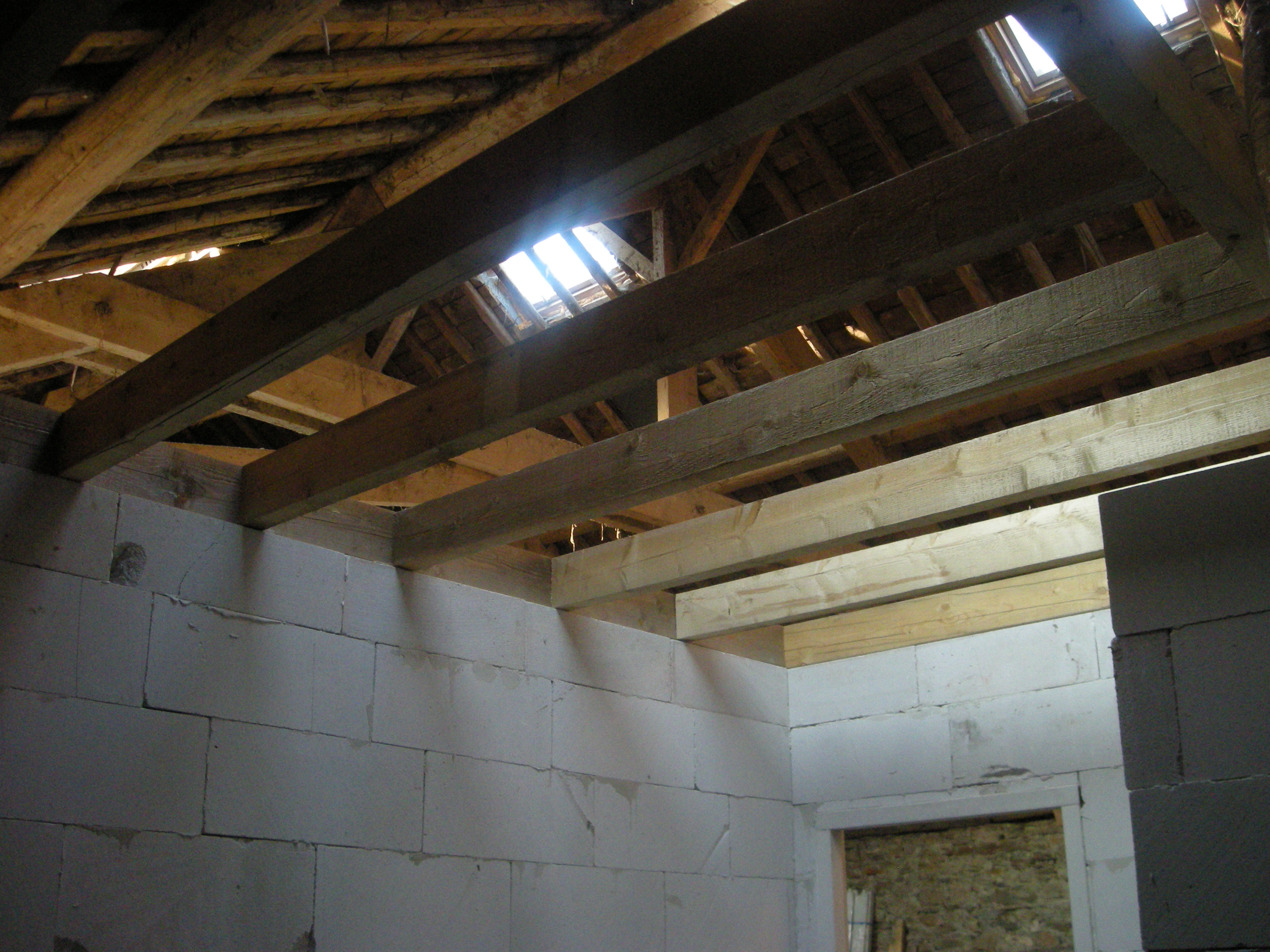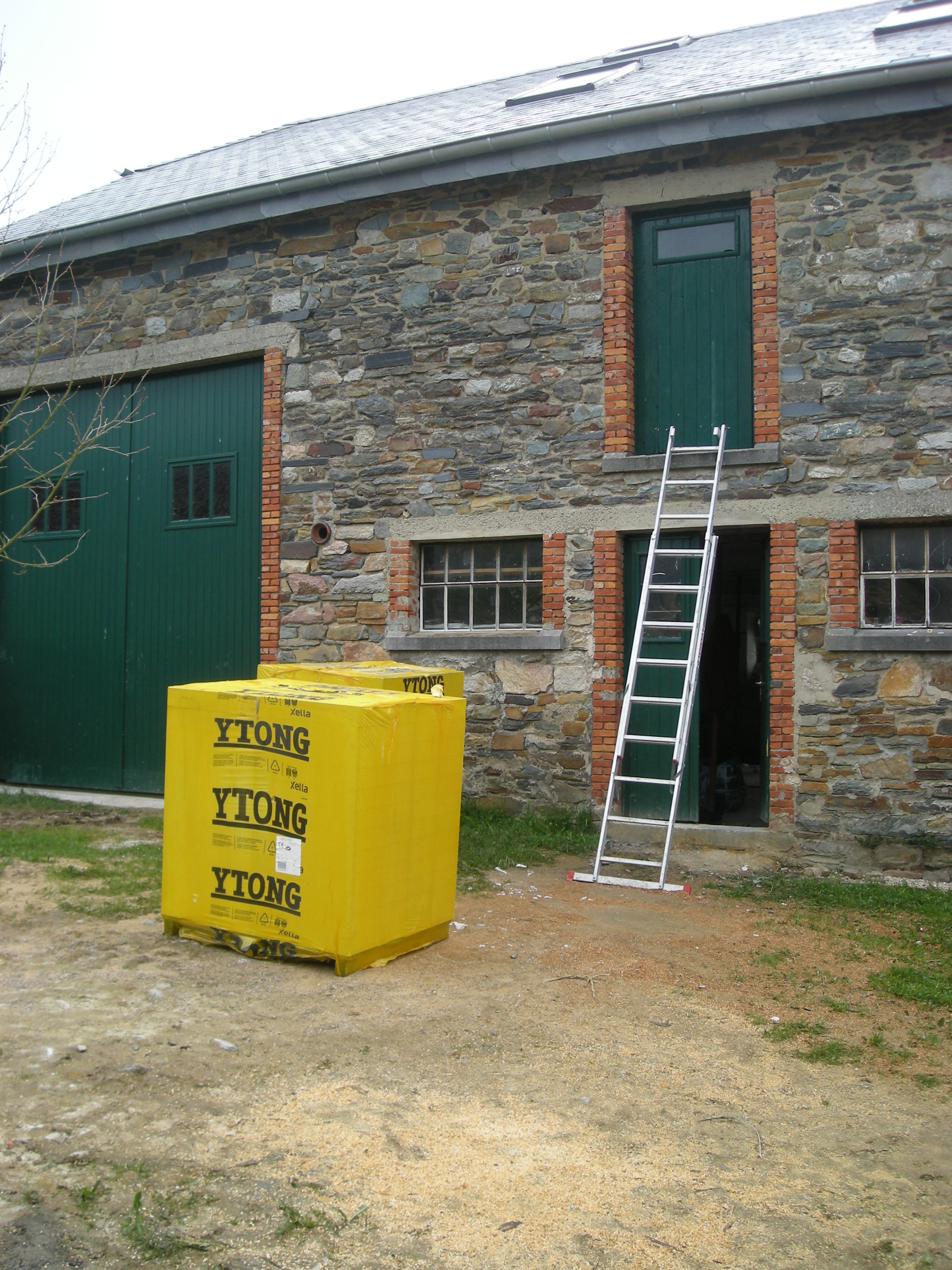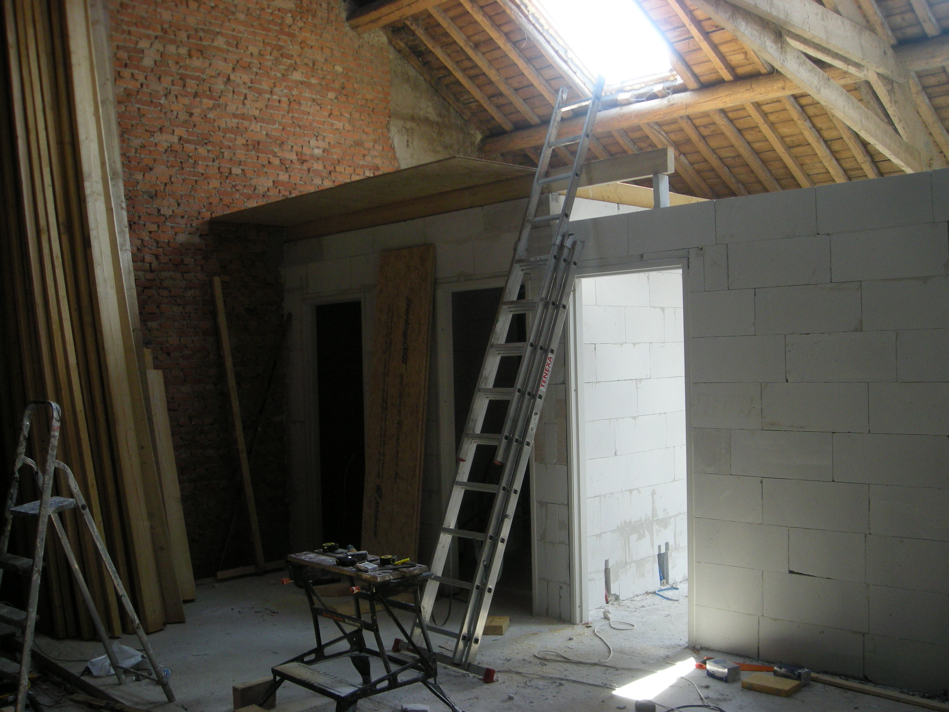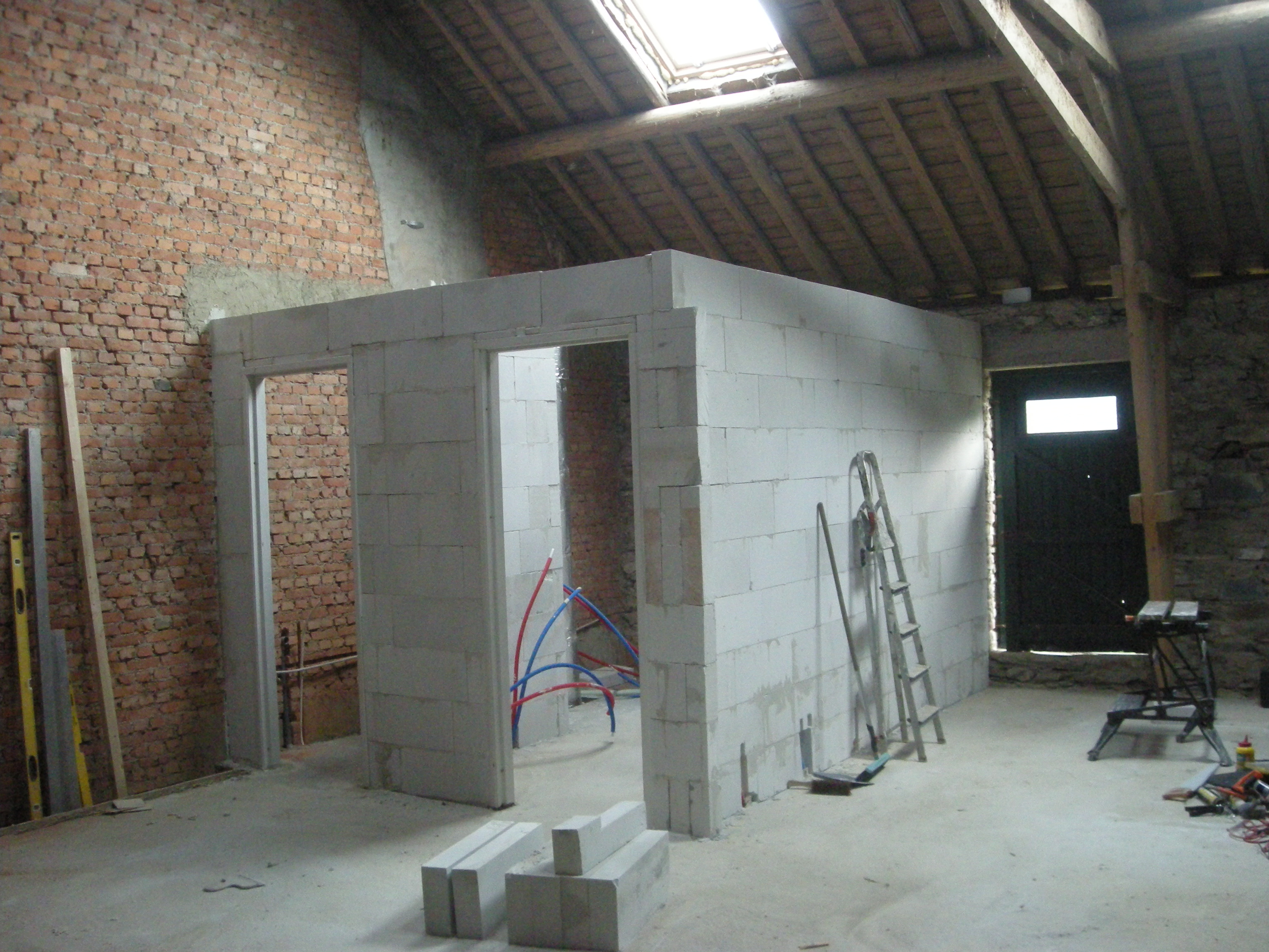 De muren van de kamers werden in Ytong blokken opgetrokken die door Gedimat Gouvy werden geleverd. Vooral het omhoogsjouwen van de blokken viel niet mee en later besloten we toch maar even de lift van Jaap te gaan lenen.
