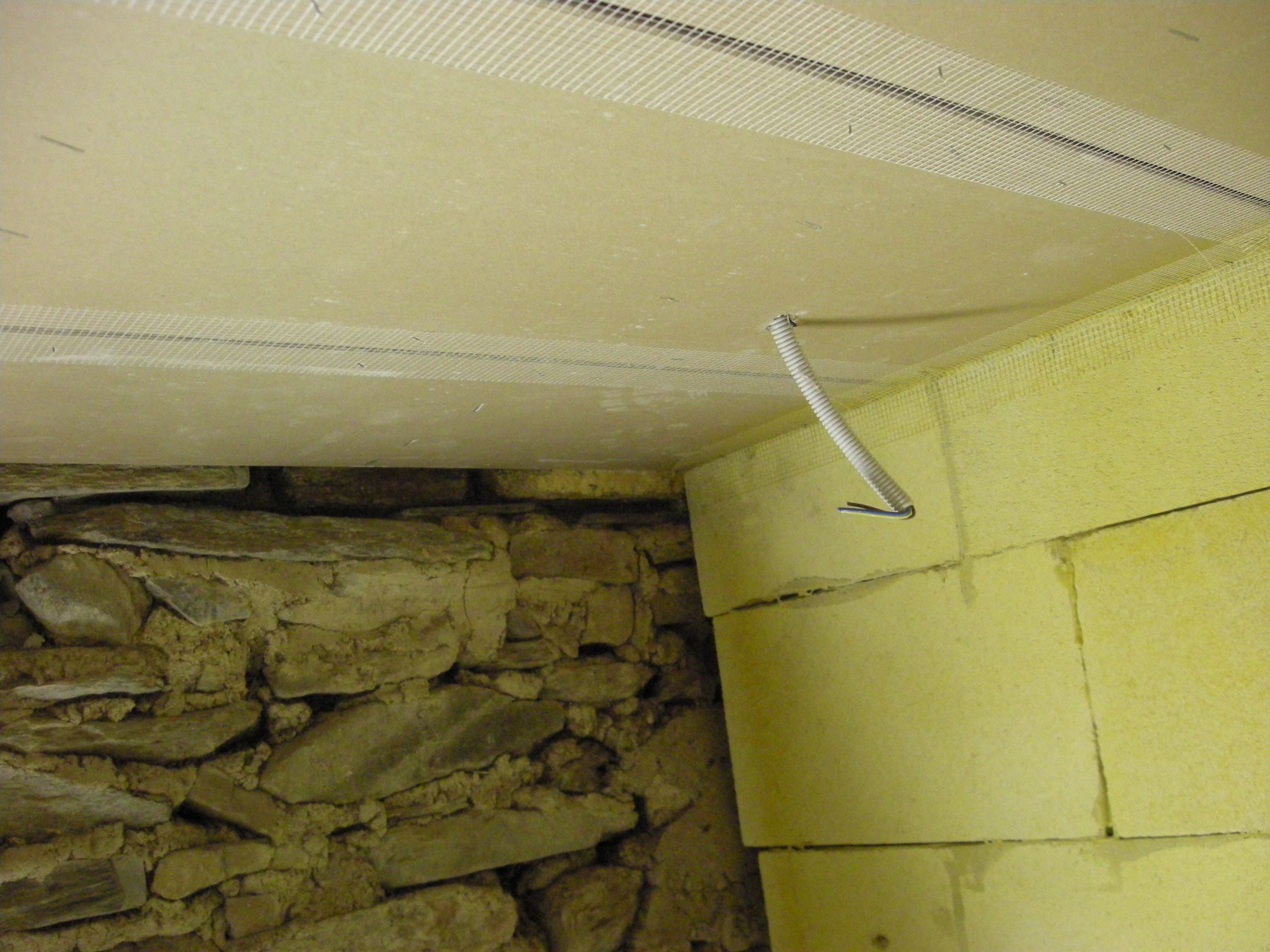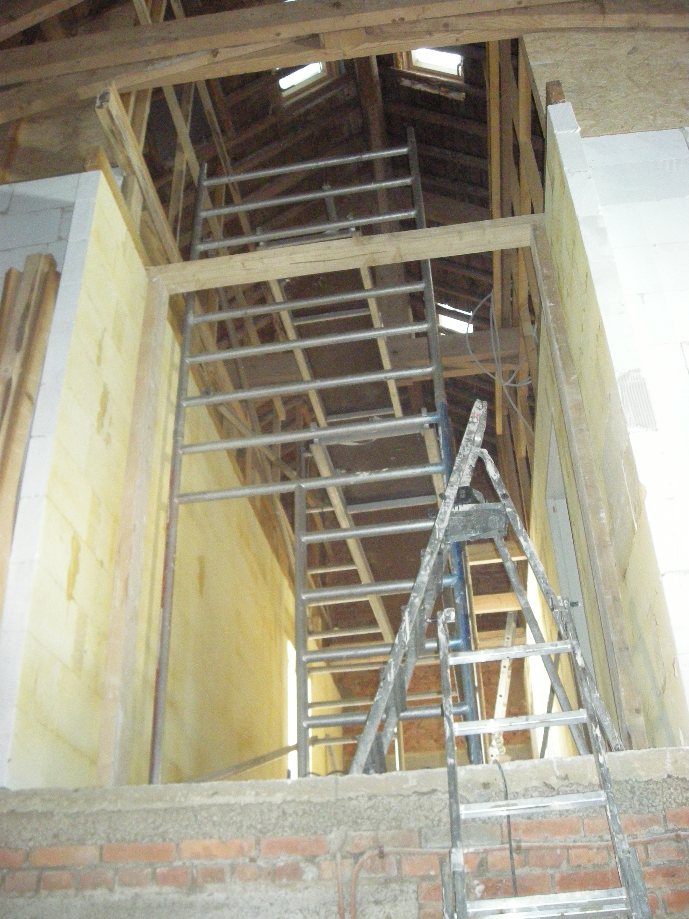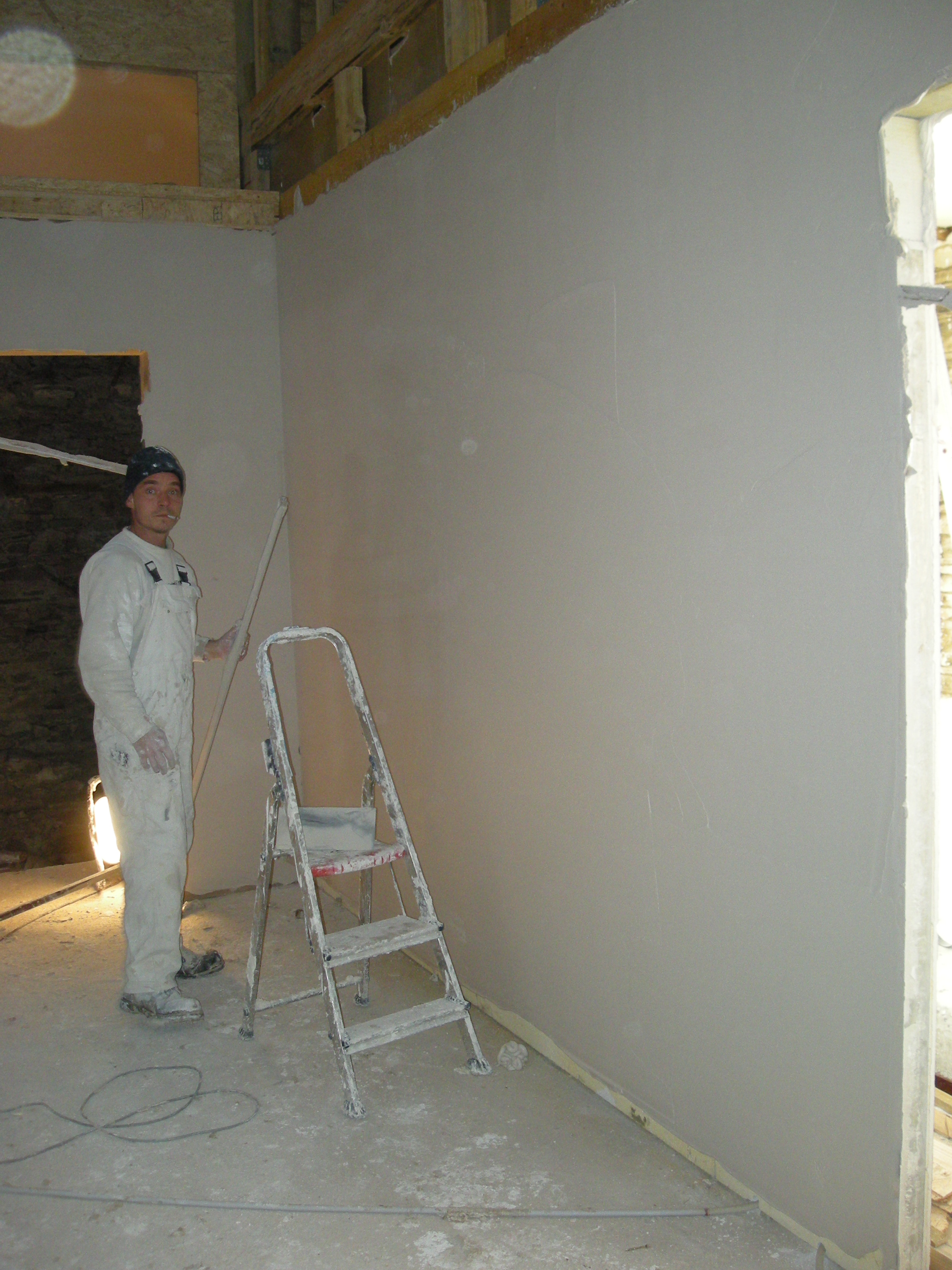 We hadden gevraagd of de stucadoor de plafonds er ook in wilde maken en de muren wilde stucken. Gezien alle drukte met de nieuwe baan in Duitsland zagen we het niet zitten dat allemaal zelf te doen. De mannen schoten flink op en tussen de bedrijven door timmerden we nog wat wanden erin die uiteraard goed voorzien werden van isolatie.