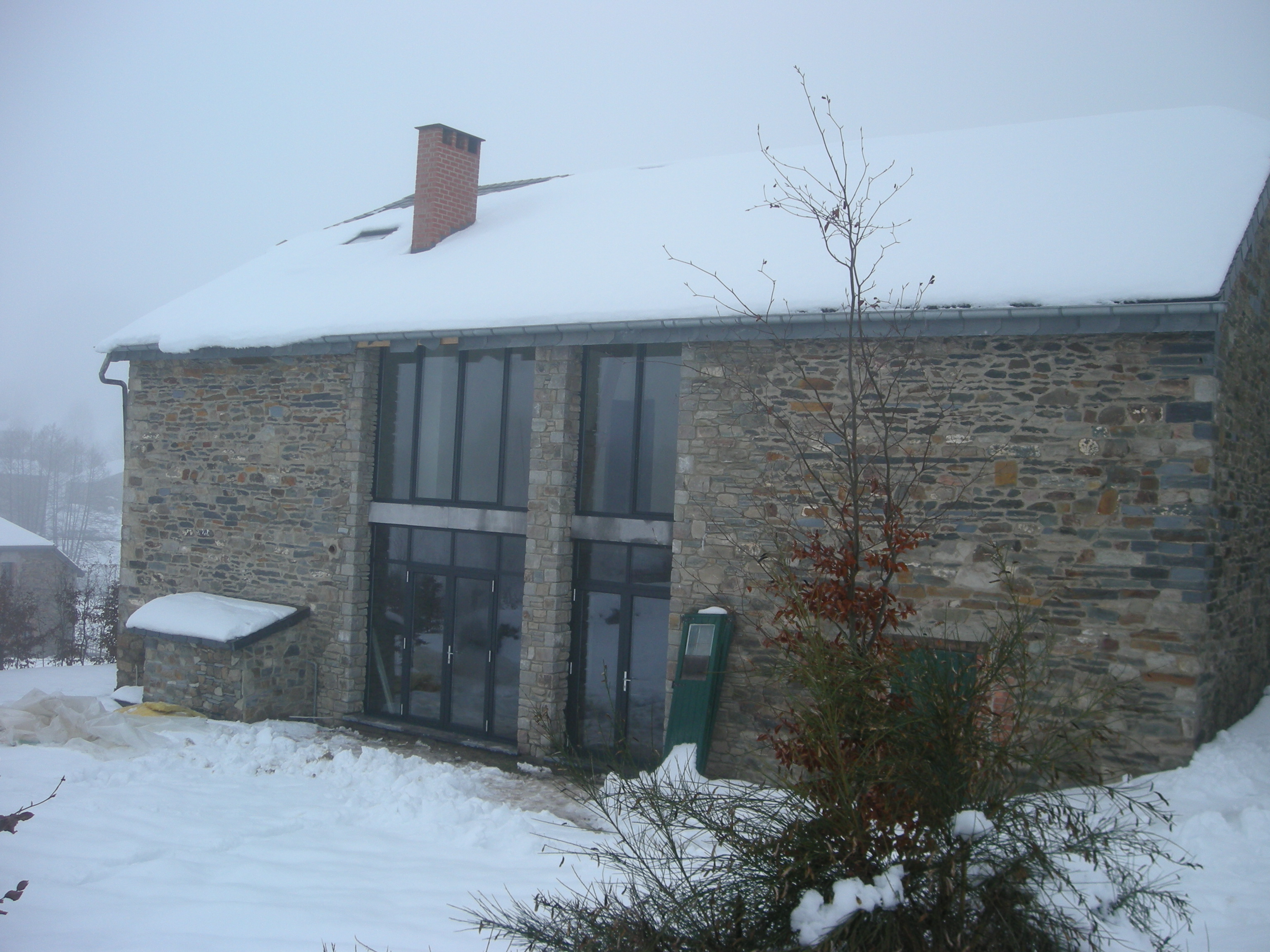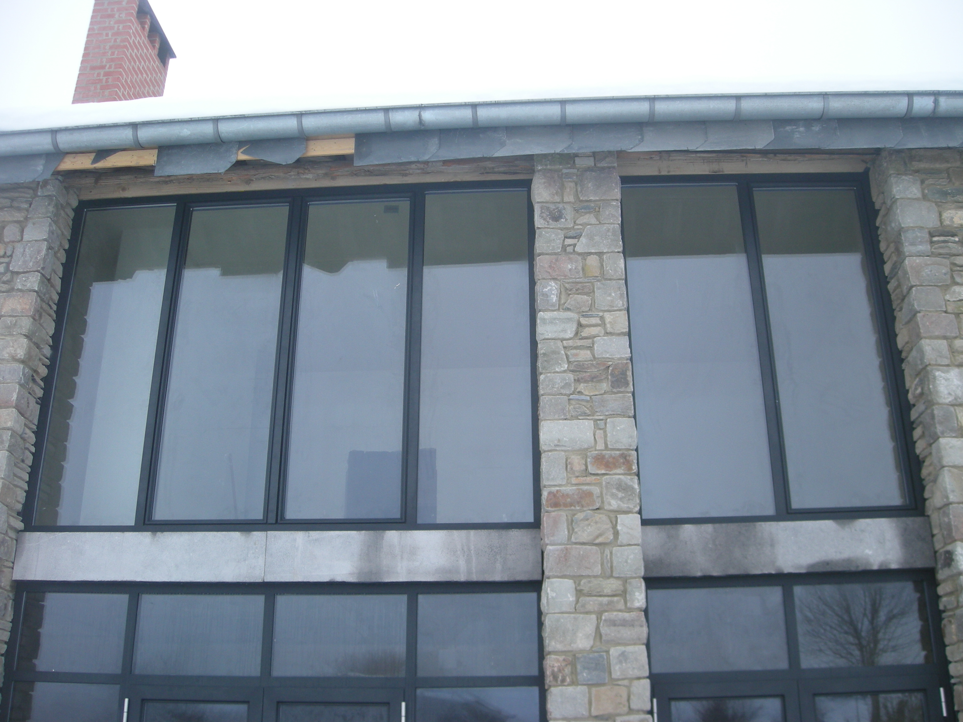 Na veel geduvel met lokale leveranciers hadden we uiteindelijk bij het bedrijf Rutolux in Groesbeek puien besteld die letterlijk tussen de (sneeuw-)buien door geplaatst werden. Toni had in de sneeuw en de strenge vorst de natuurstenen dorpels geplaatst en ik bij -14 graden de stelkozijnen. Vlak voor de kerst kwamen de vier mannen met twee bussen en een aanhanger door de ijzel en de sneeuw en plaatsten de puien erin. Gelukkig paste het geheel goed in de kozijnen.