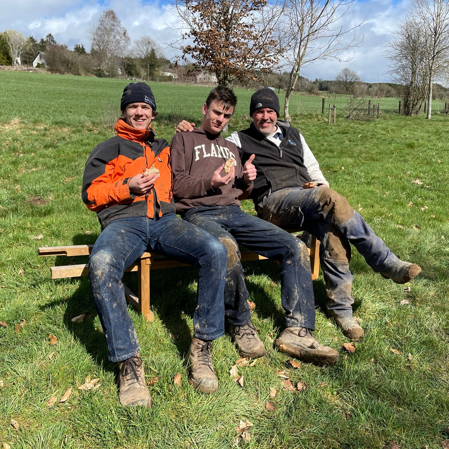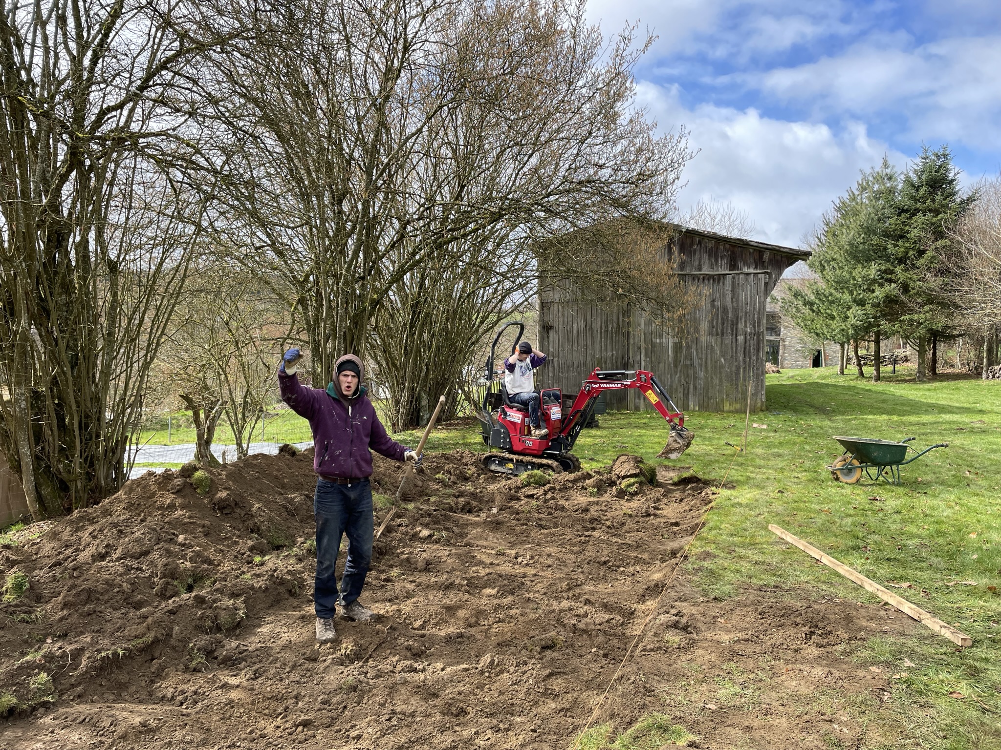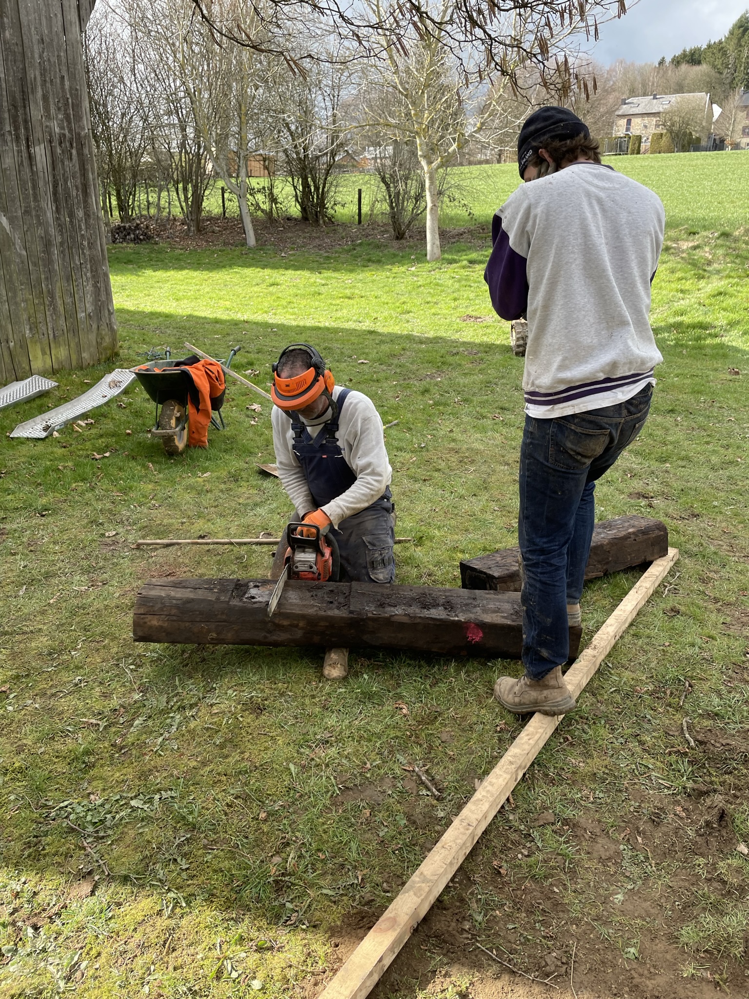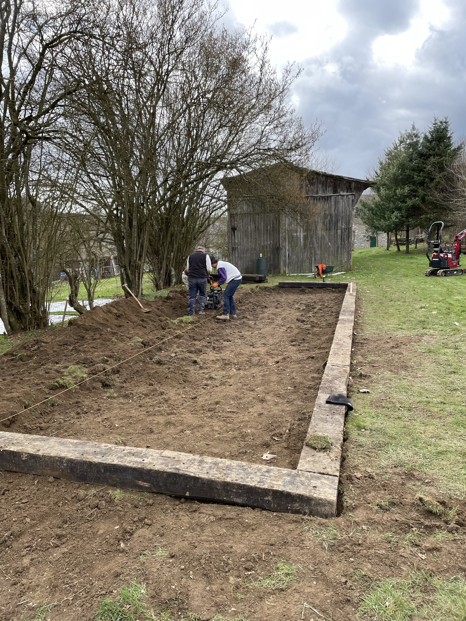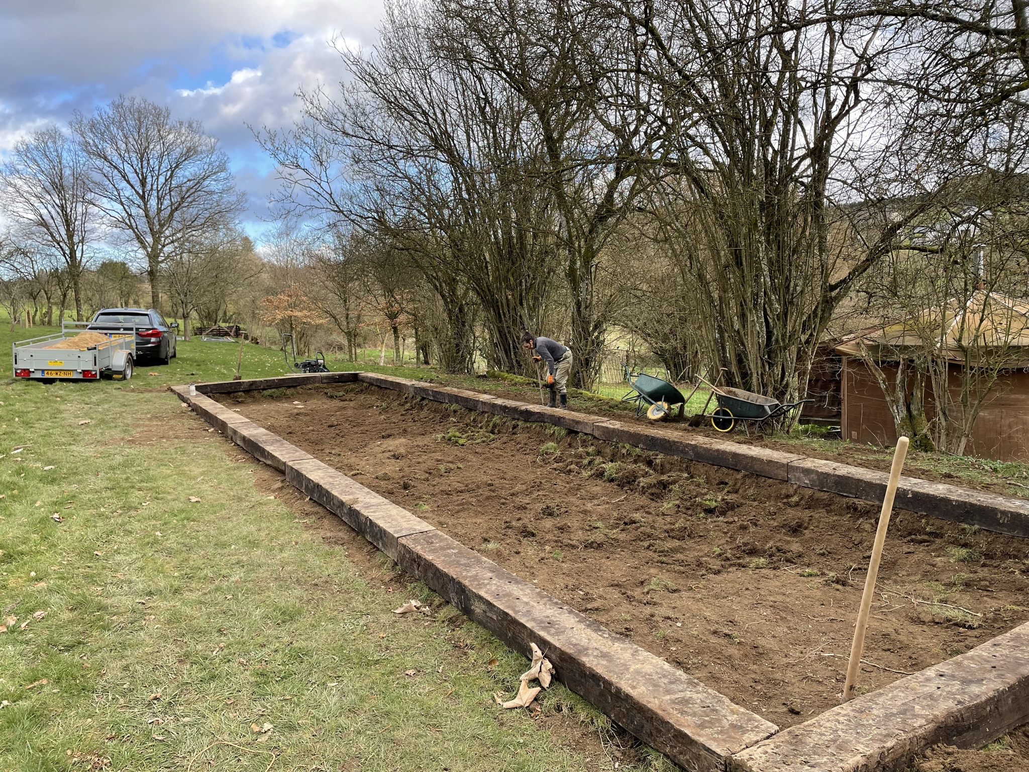 In Nijkerk tikten we een partijtje bielzen op de kop die als randen moesten gaan functioneren. Op de aanhanger – wellicht wat overbelast – werden die naar de Ardennen gereden. Bij Locacentre huurden we een klein kraantje en begonnen met graven. Uiteraard een populair klusje dat ook Lies zich niet liet ontzeggen. Al snel hadden we een flinke kuil gegraven en de eerste bielzen konden worden gelegd. Als volleerde Egyptenaren rolden we ze op ronde paaltjes naar hun bestemming.