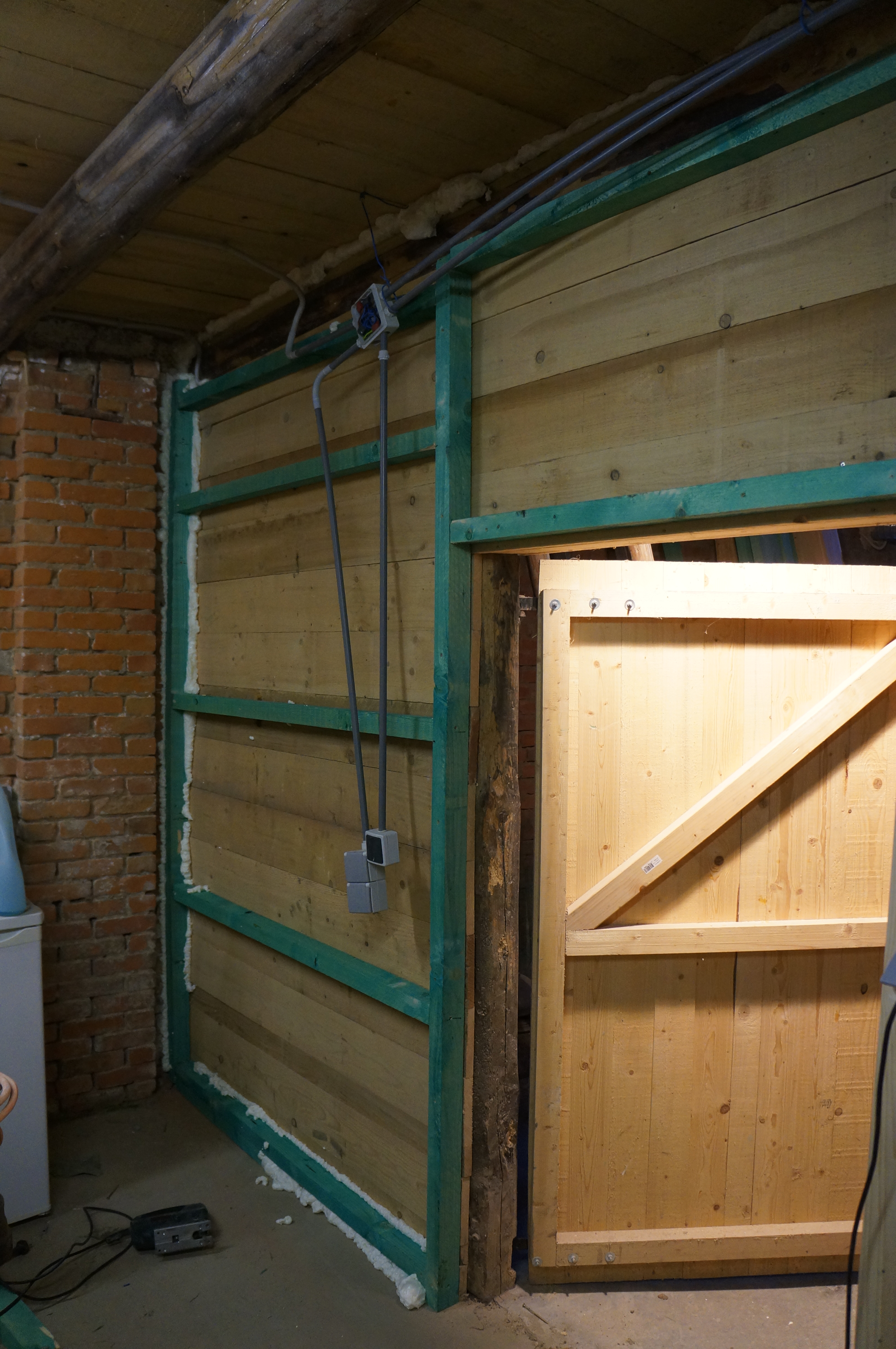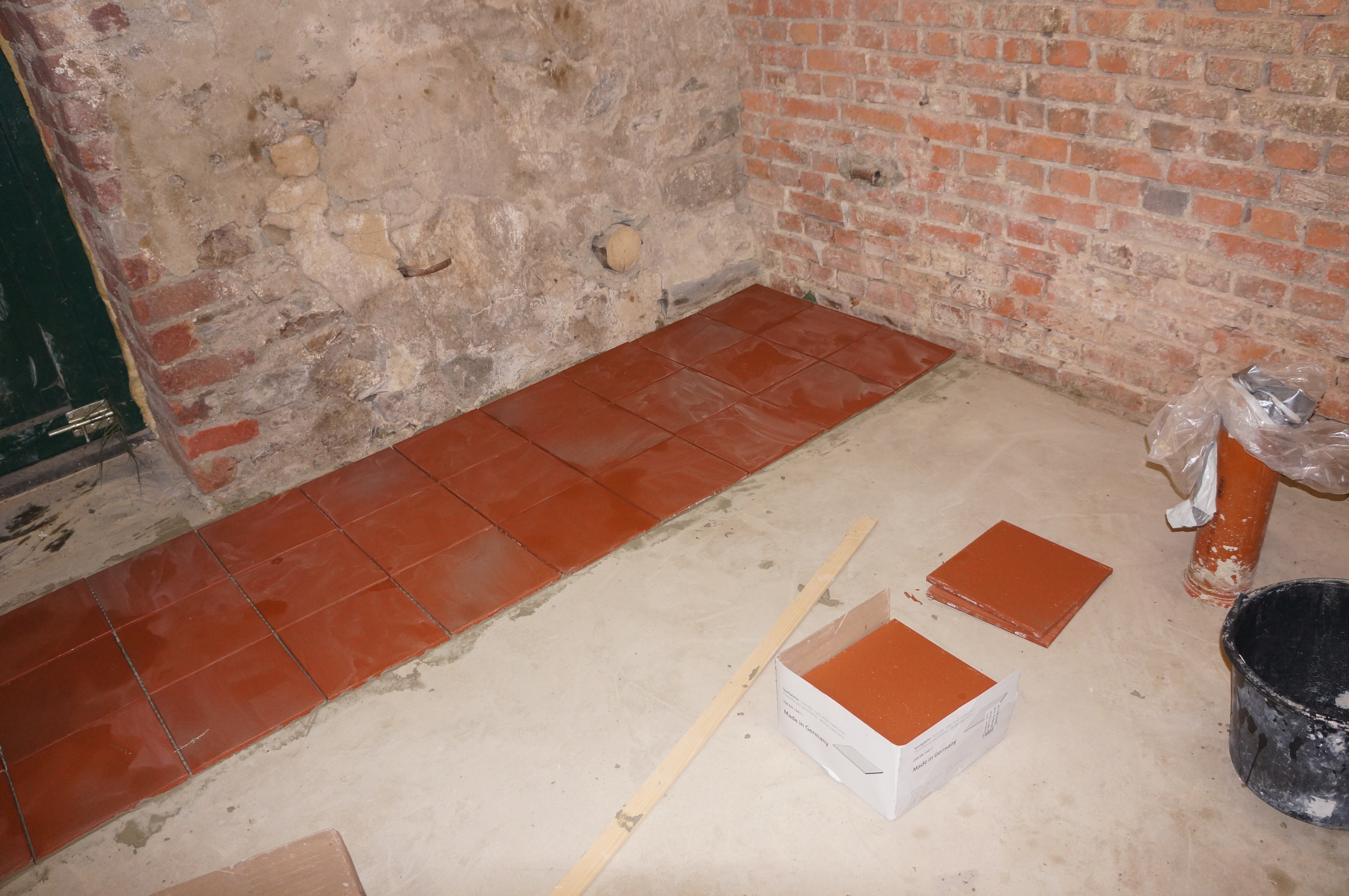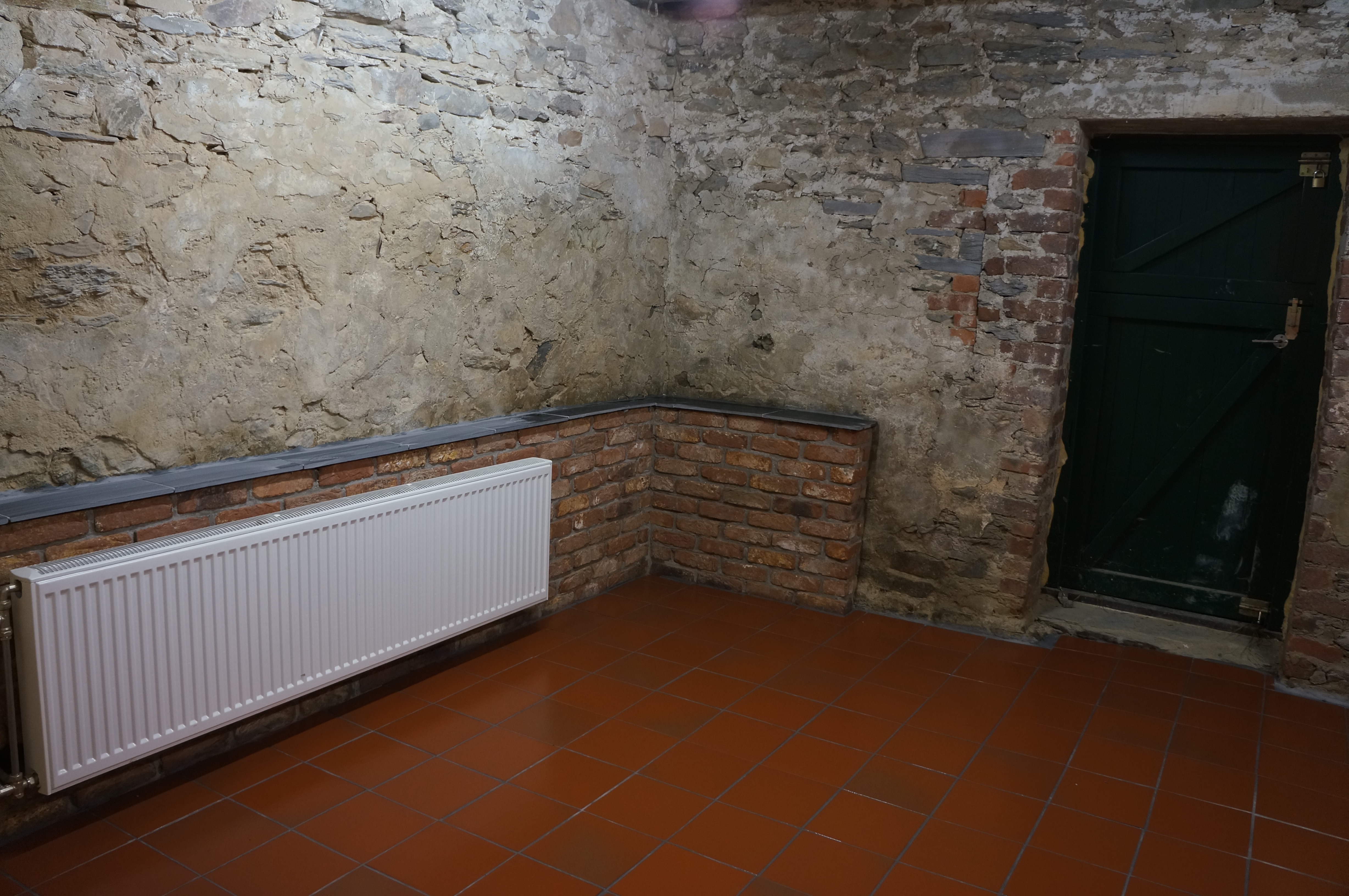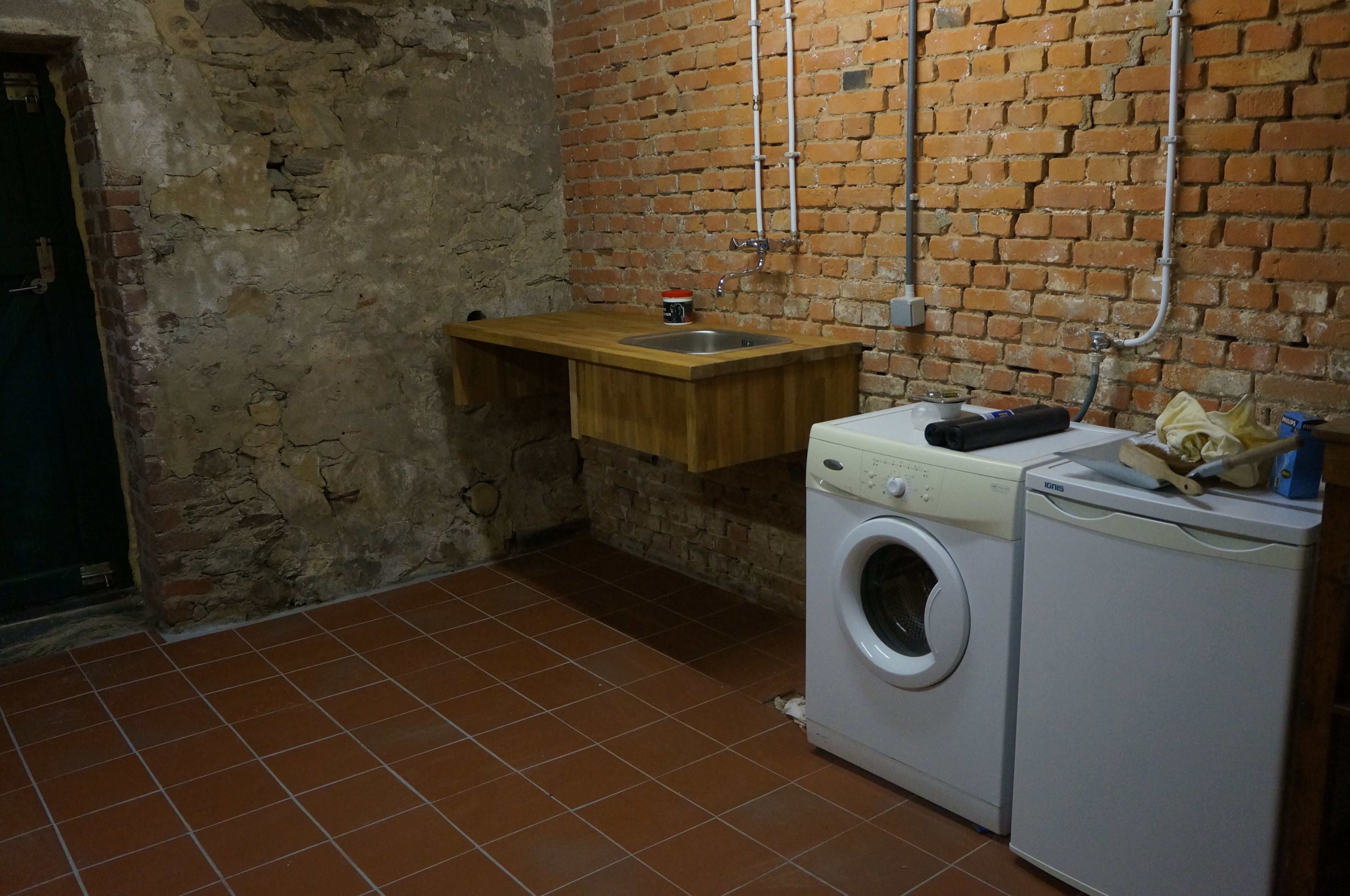 Tony Renard haalde de oude vloer eruit en stortte een stevige plaat beton. Ook moest de ruimte natuurlijk van warm en koudstromend water, CV en zelfs nog twee extra elektragroepen voorzien worden. Tijdens de verbouwing van de hooizolder legden we dus nog maar wat extra buizen onder het beton. Verwarming betekent natuurlijk ook automatisch weer isolatie. Uiteindelijk begonnen we pas aan het einde van 2012 aan de isolatie van het plafond en de wand. Vanwege vochtdoorslag van de buitenmuur besloten we nog een klein spouwmuurtje op te trekken waar ook de radiator gemakkelijk aan kon worden opgehangen. Nadat de vloer met ‘Spaltplatten’ betegeld werd kon dan eindelijk de wasmachine erin.