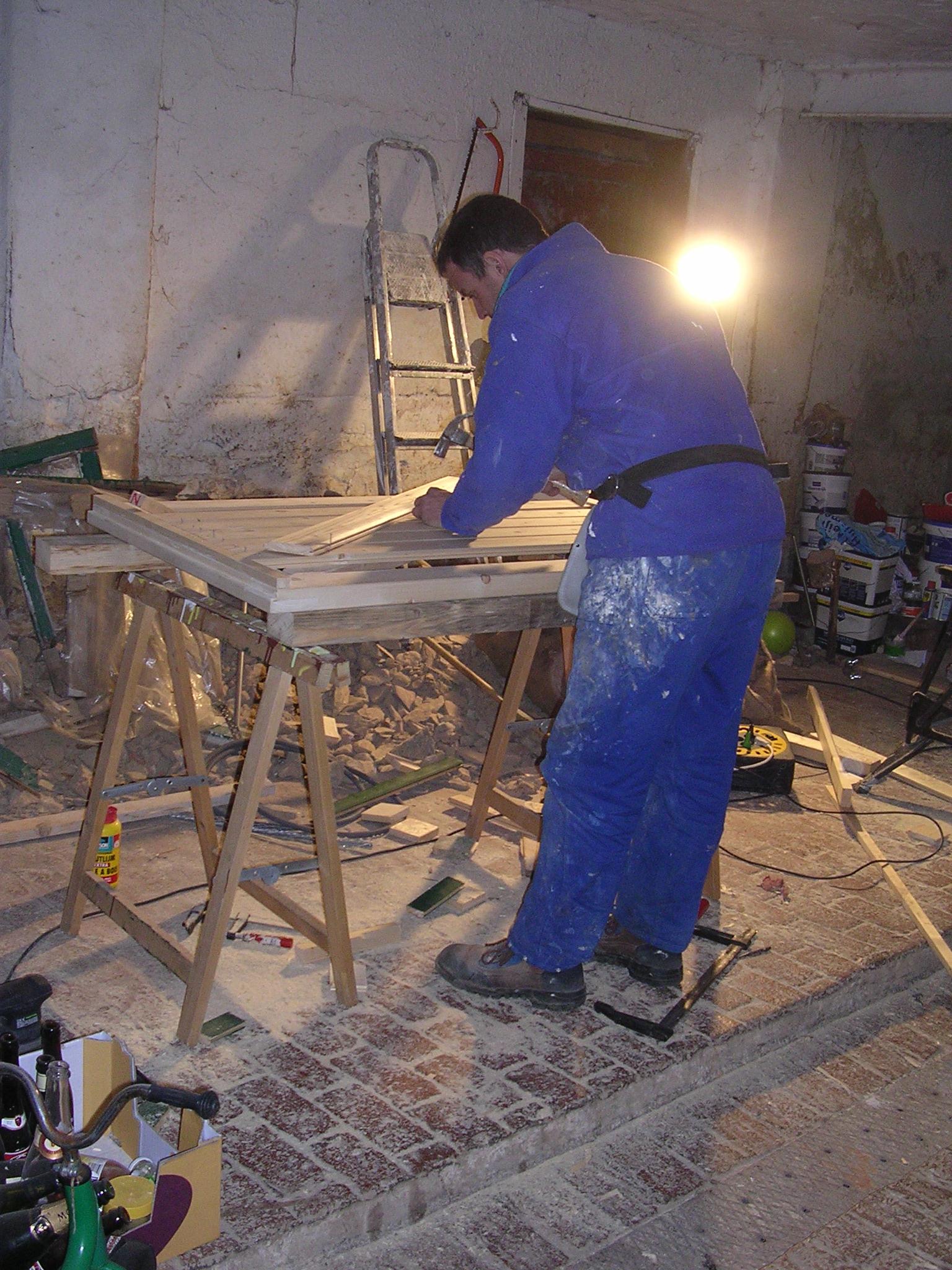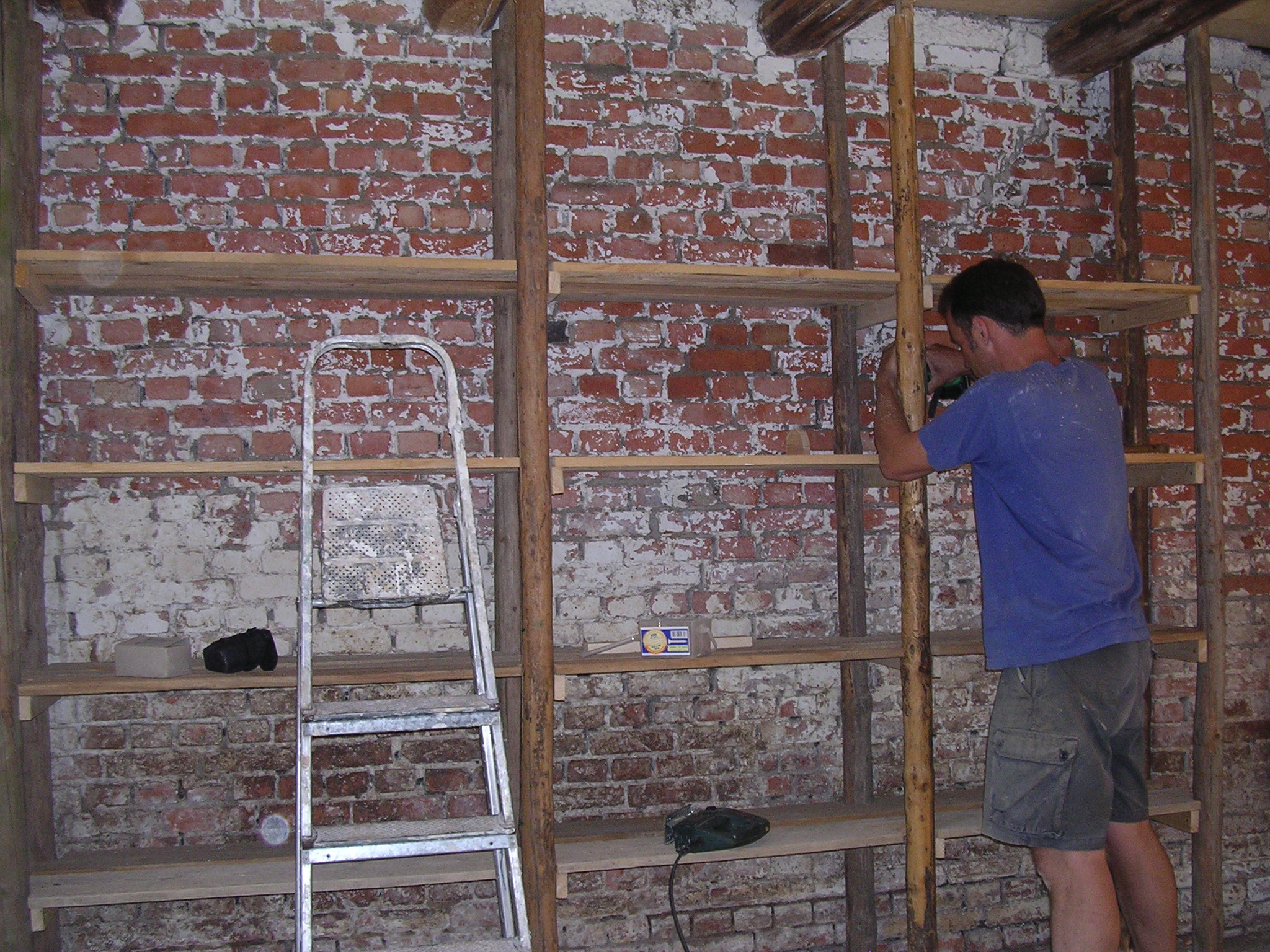 Nadat de boel dicht gemaakt was is er eerst een tijd niks gebeurd tot de verdere plannen ontwikkeld werden. Een klushok moest het worden met een paar flinke stellingen voor het immer groter wordende gereedschapsarsenaal. Dat betekende dat eerst de oude zolderplanken en houten wand gesloopt moesten worden. Alles zat onder een dikke laag kalk, poep en spinnewebben. Echt een fijn klusje, gelukkig was het kampvuur niet ver weg.