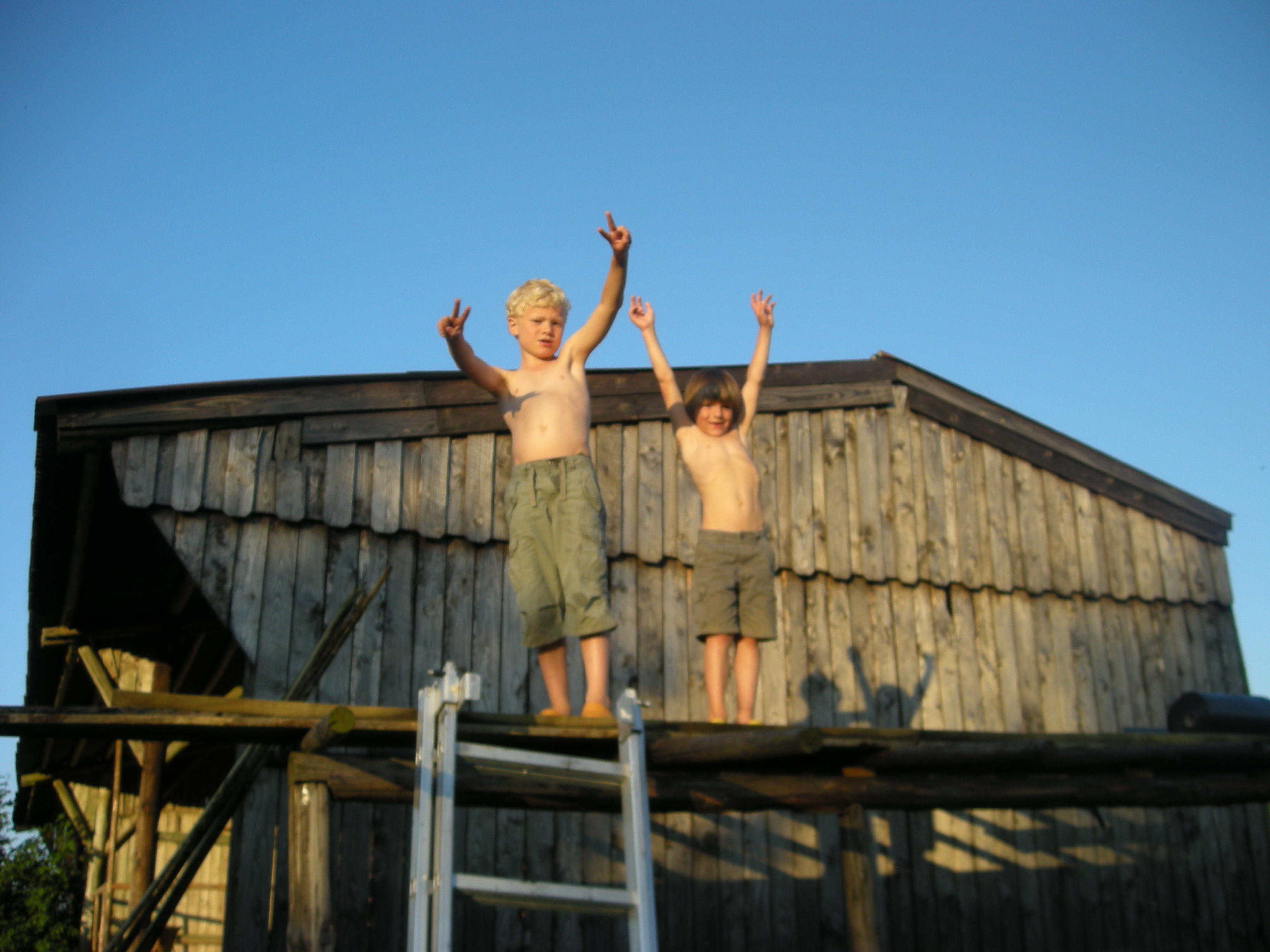 De open zijkant is inmiddels weer van ruwe gecarbolineumde planken voorzien. De onderkant is koud tegen elkaar gespijkerd, het bovenste deel is Zweeds gepotdekseld. Een jaartje later hebben we een veranda aan de zijkant gebouwd. Eerst met een houten dak van Larix delen, dat lekte zo erg dat we later er toch maar leitjes op hebben gemaakt.