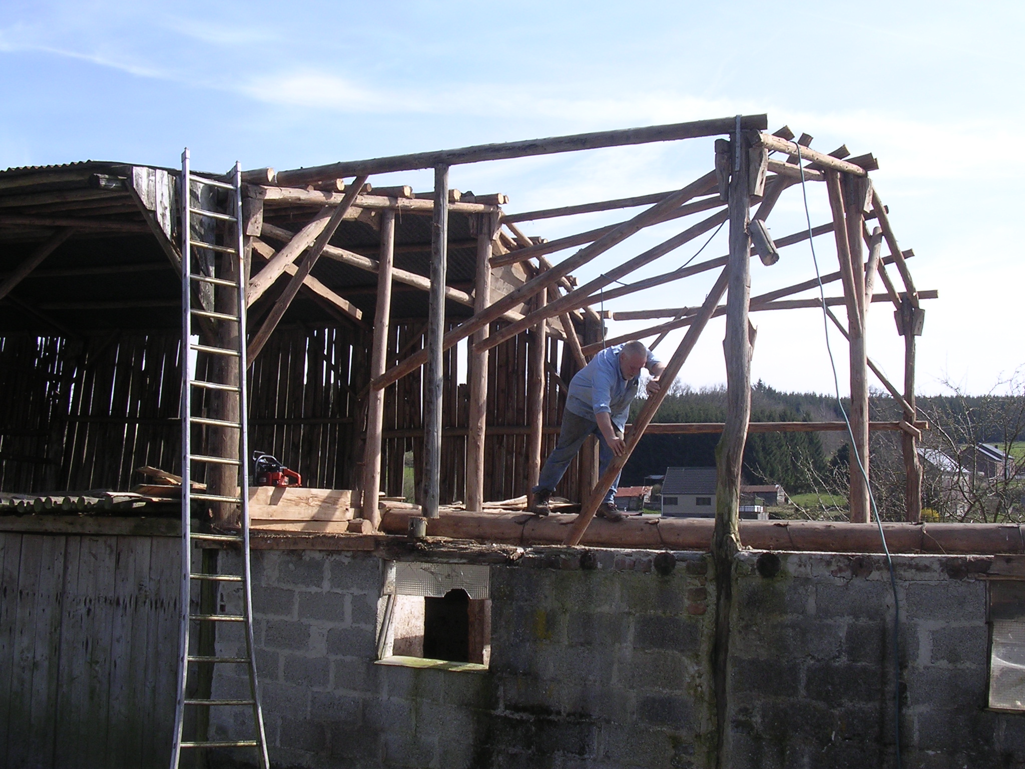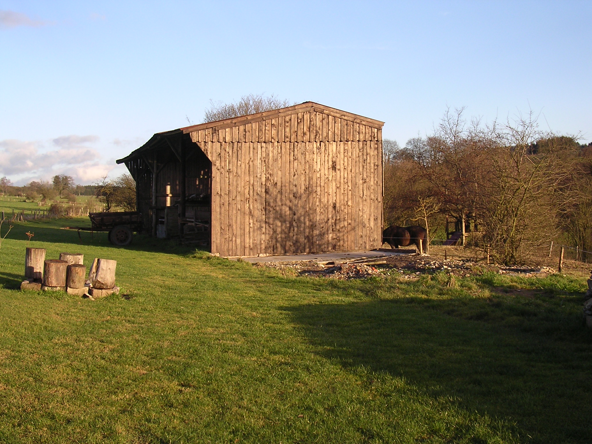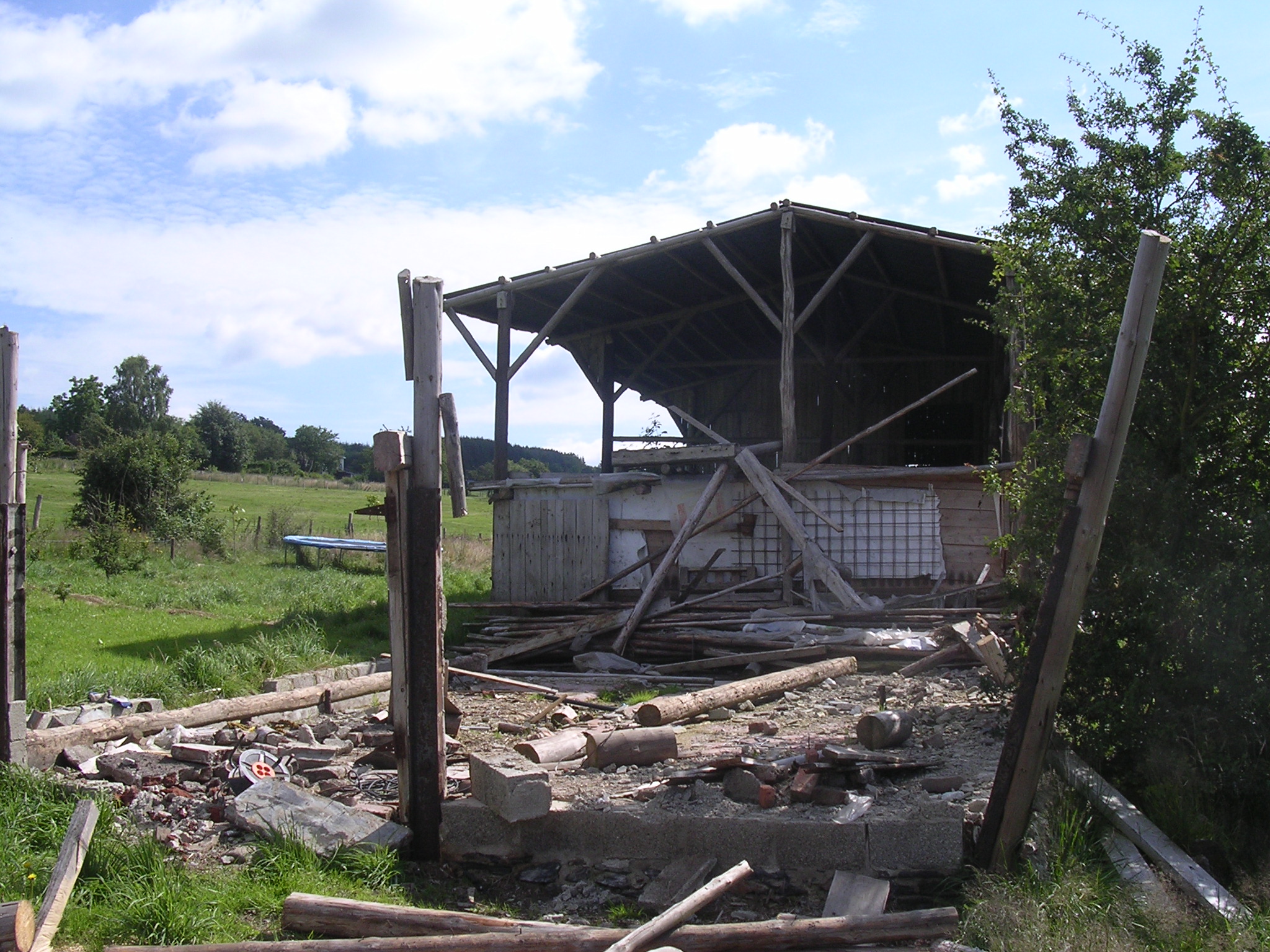 Op het terrein stond een grote houten loods met een open kant en een stenen koeienstal. De loods was veel te groot en we hebben ongeveer de helft gesloopt. Jaap heeft het meeste werk gedaan: slopen, afvoeren en opruimen. Wij hebben zelf veel hout gezaagd, gekloofd en veel puin afgevoerd.