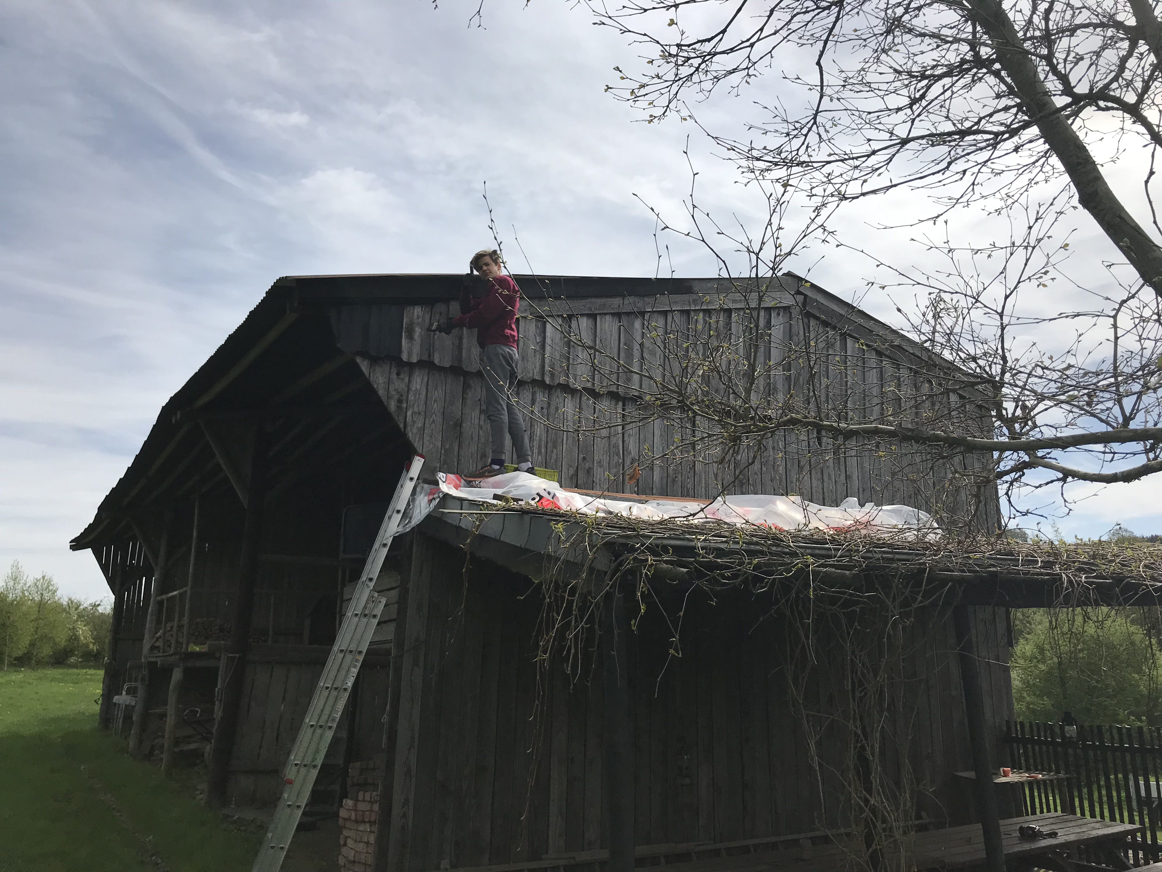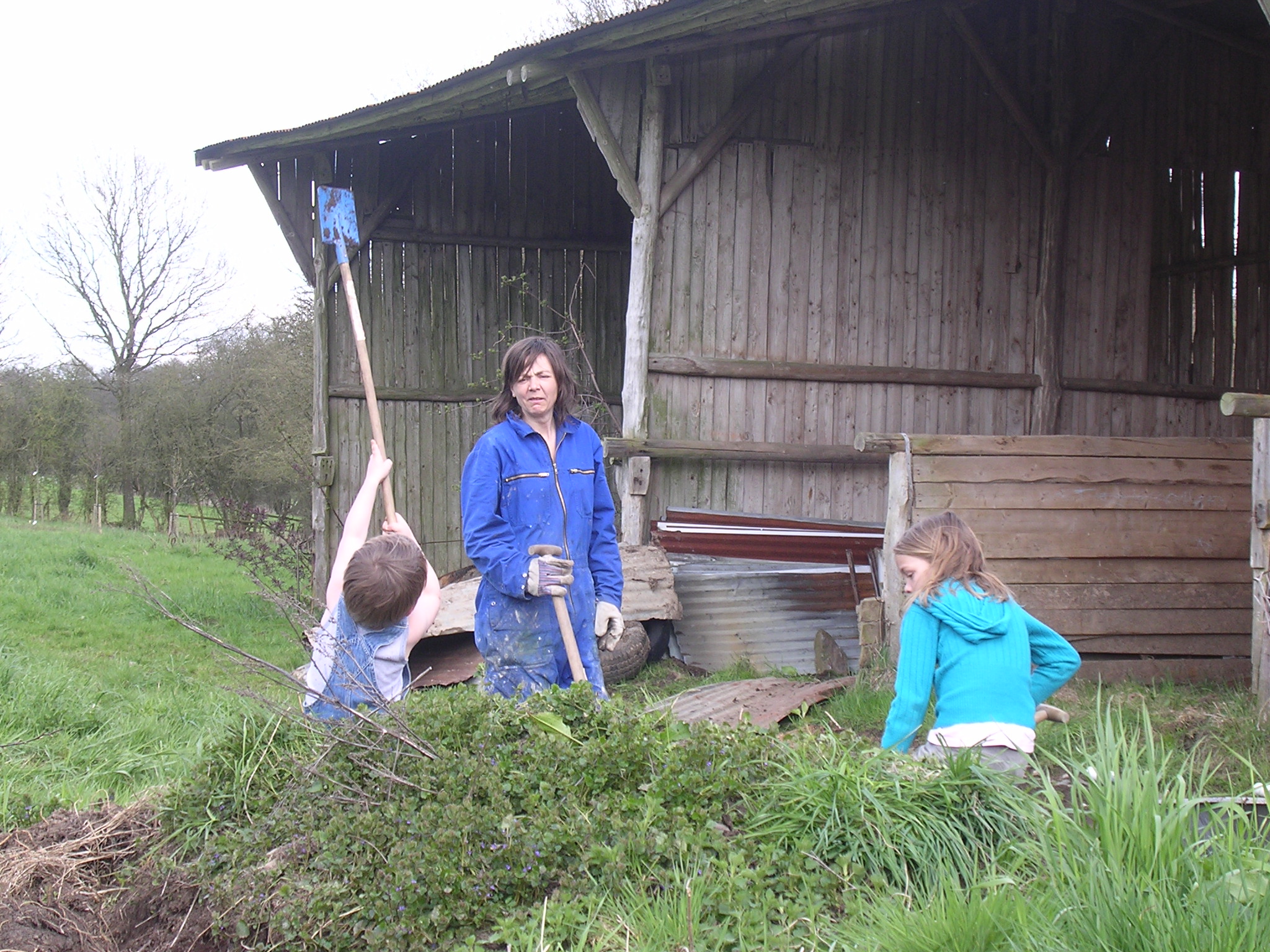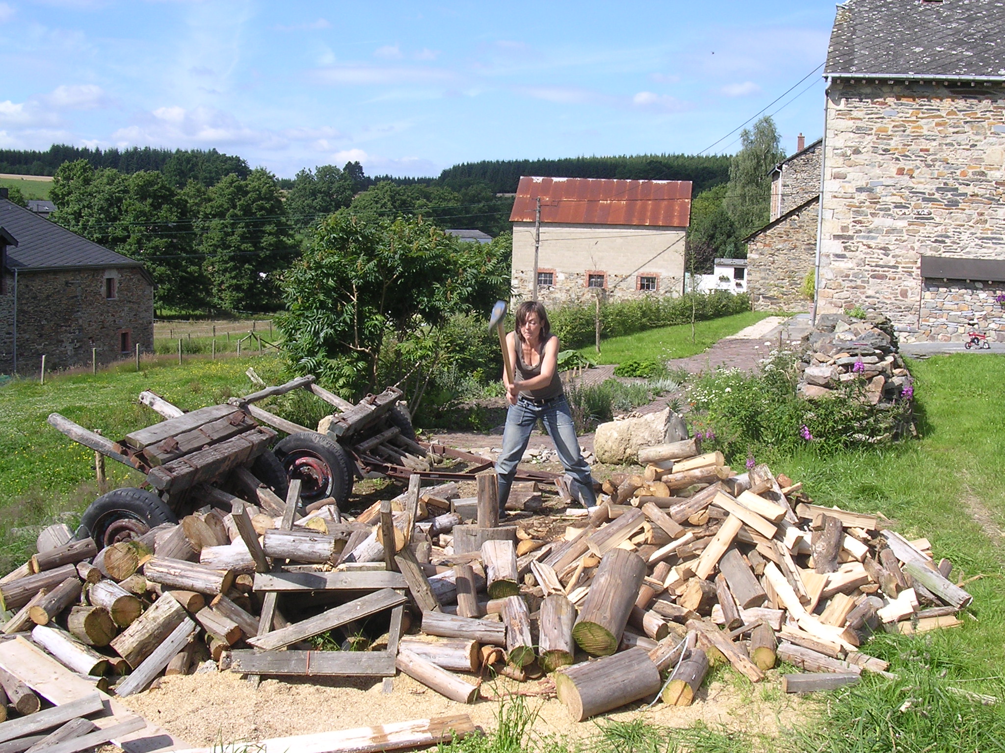 Op het terrein stond een grote houten loods met een open kant en een stenen koeienstal. De loods was veel te groot en we hebben ongeveer de helft gesloopt. Jaap heeft het meeste werk gedaan: slopen, afvoeren en opruimen. Wij hebben zelf veel hout gezaagd, gekloofd en veel puin afgevoerd.