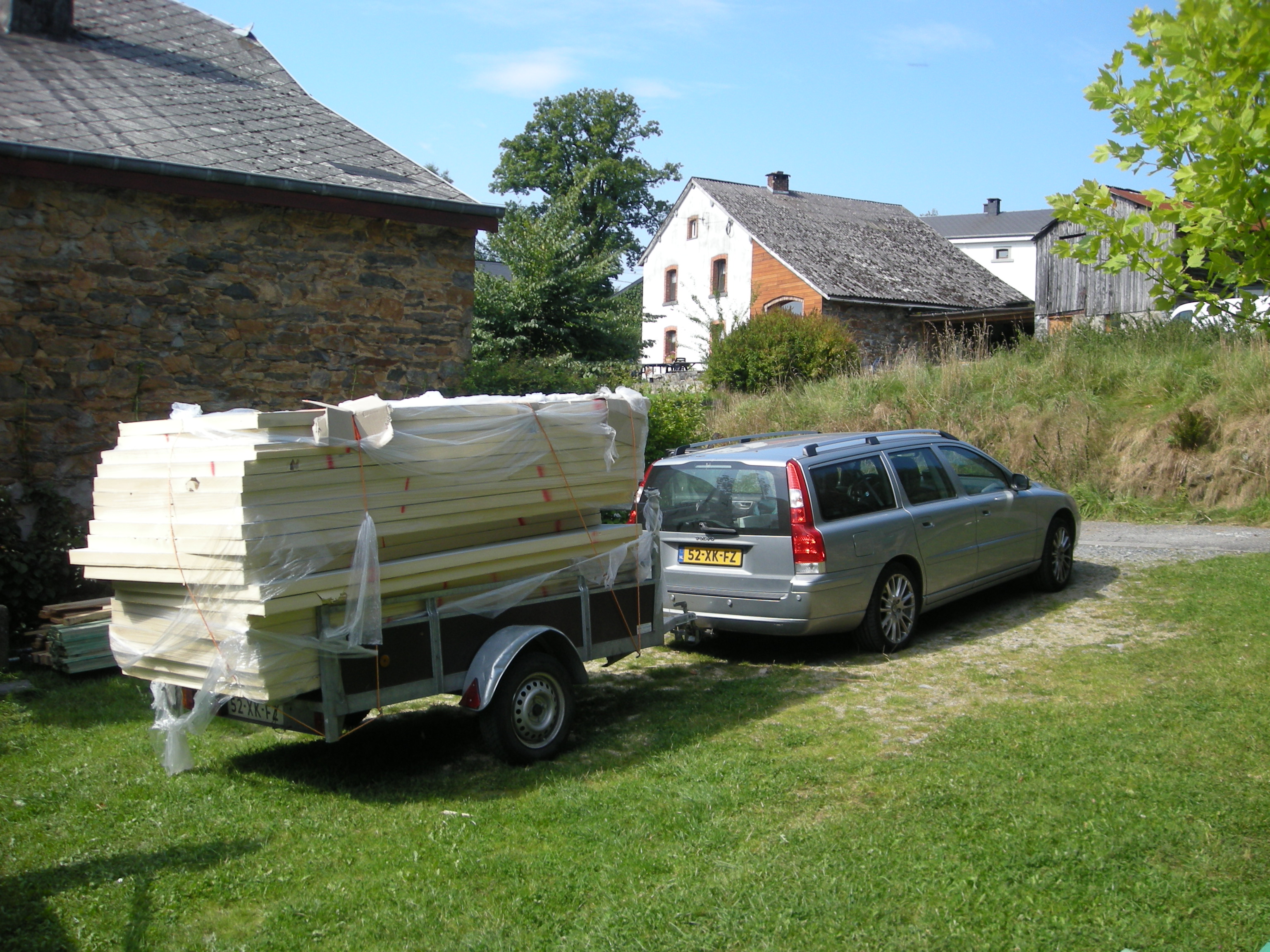 De isolatie kwam via marktplaats van een adresje in Sint-Oedenrode dus dat was een spannende tocht naar Beche met verschuivende platen. Nadat de platen erop lagen en vastgezet waren met tengels kon de nieuwe dakgoot gemaakt worden. Vervolgens folie en panlatten en na een hele warme septemberdag was het dak klaar voor de leitjes.
