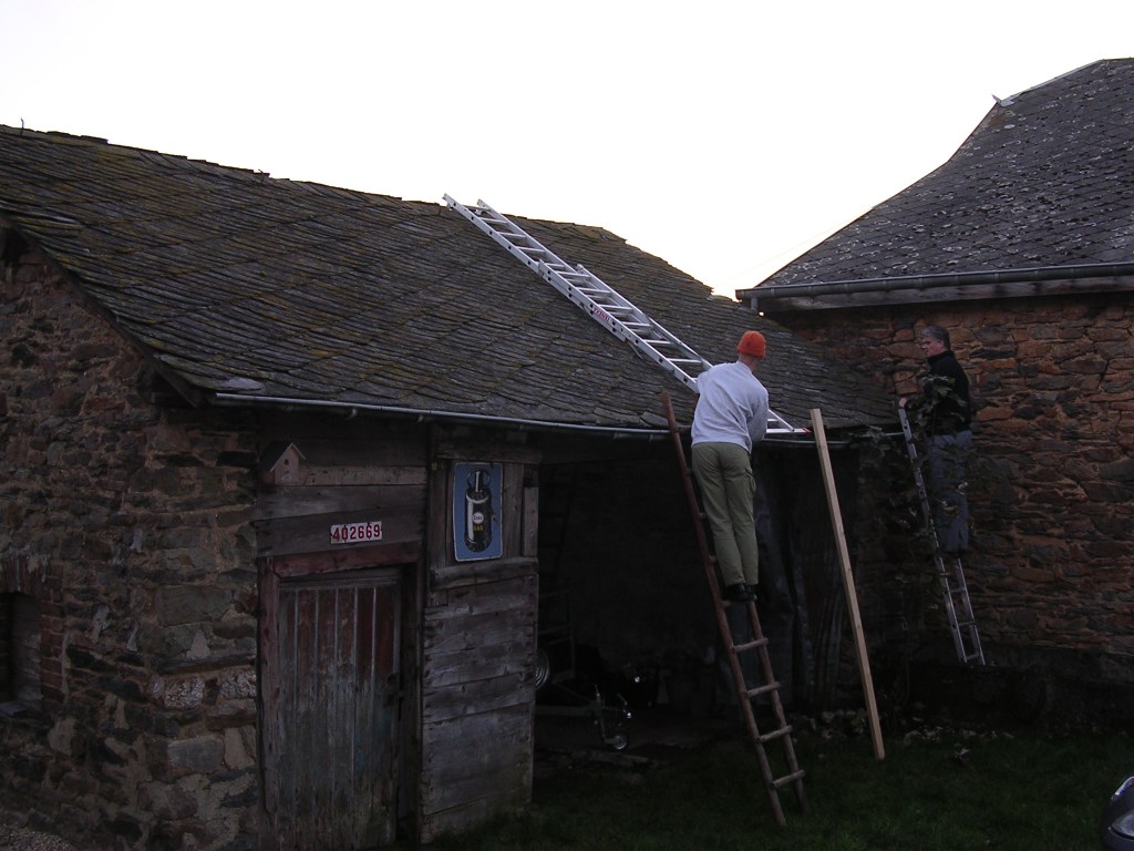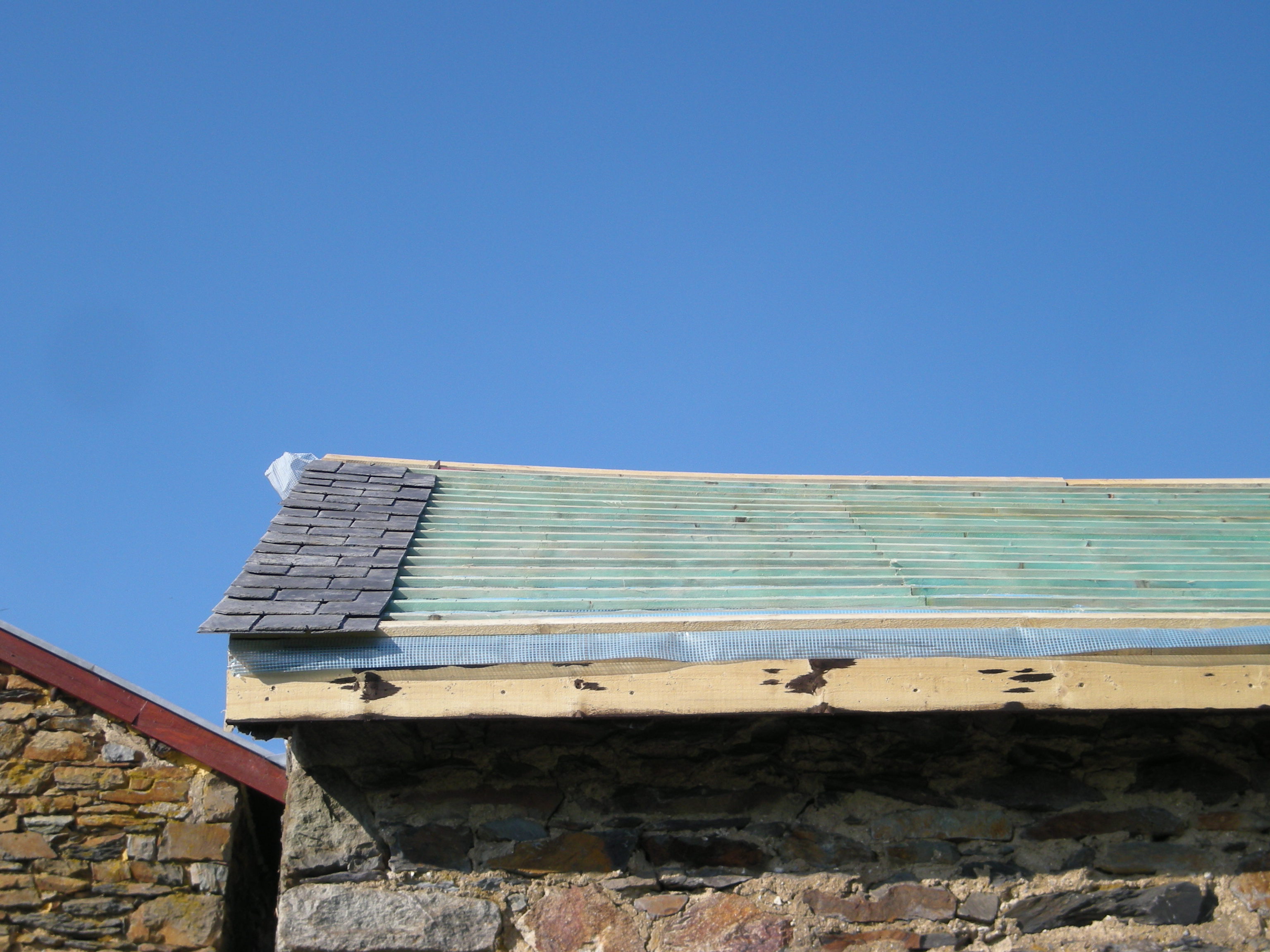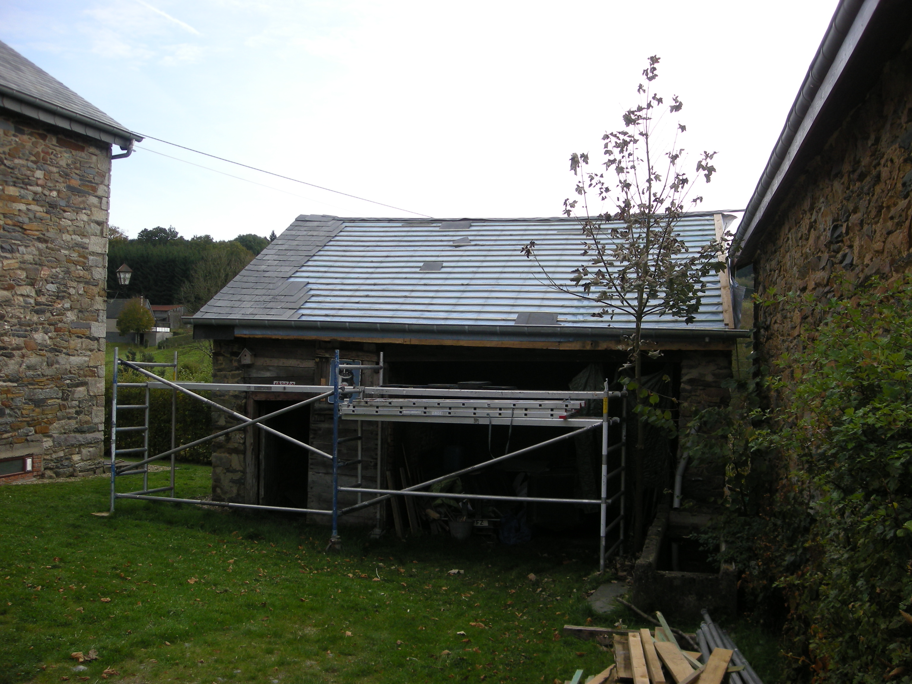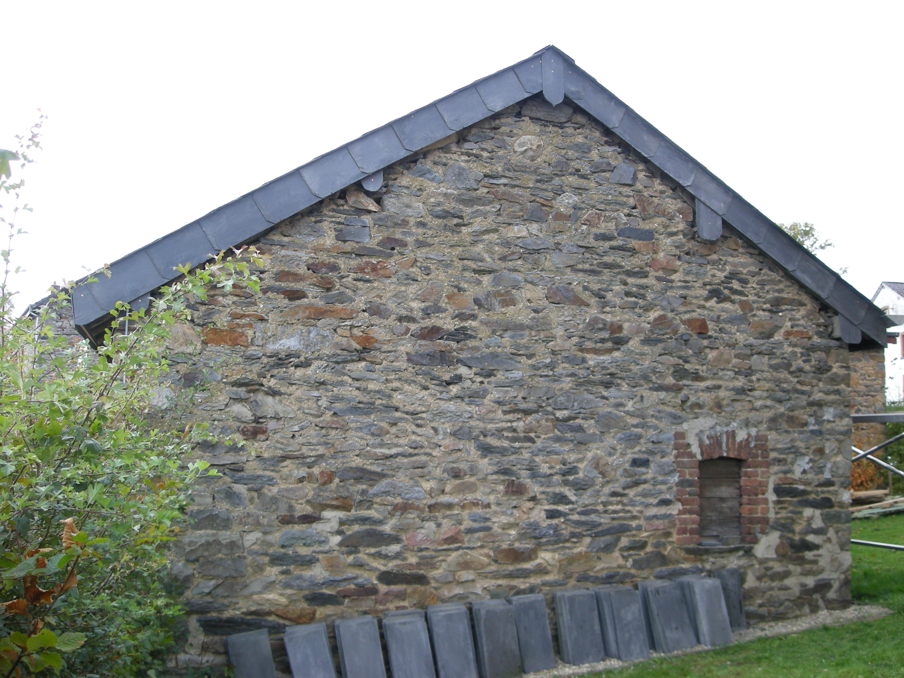 In de nazomer van 2009 zijn we van start gegaan met een nieuw dak voor het stenen schuurtje. Op het naar schatting 200 jaar oude dak lagen prachtige dikke handgekapte schubleien. Heel authentiek dus maar helaas begon het einde van de levensduur te naderen en het dakje lekte op diverse plaatsen. We hadden de oude leitjes al een paar keer rechtgelegd mar de spijkers waren verroest en veel leien gebroken. Helaas werd ook het hout hierdoor aangetast en zat er niet veel anders op dan een nieuw dak te gaan maken.