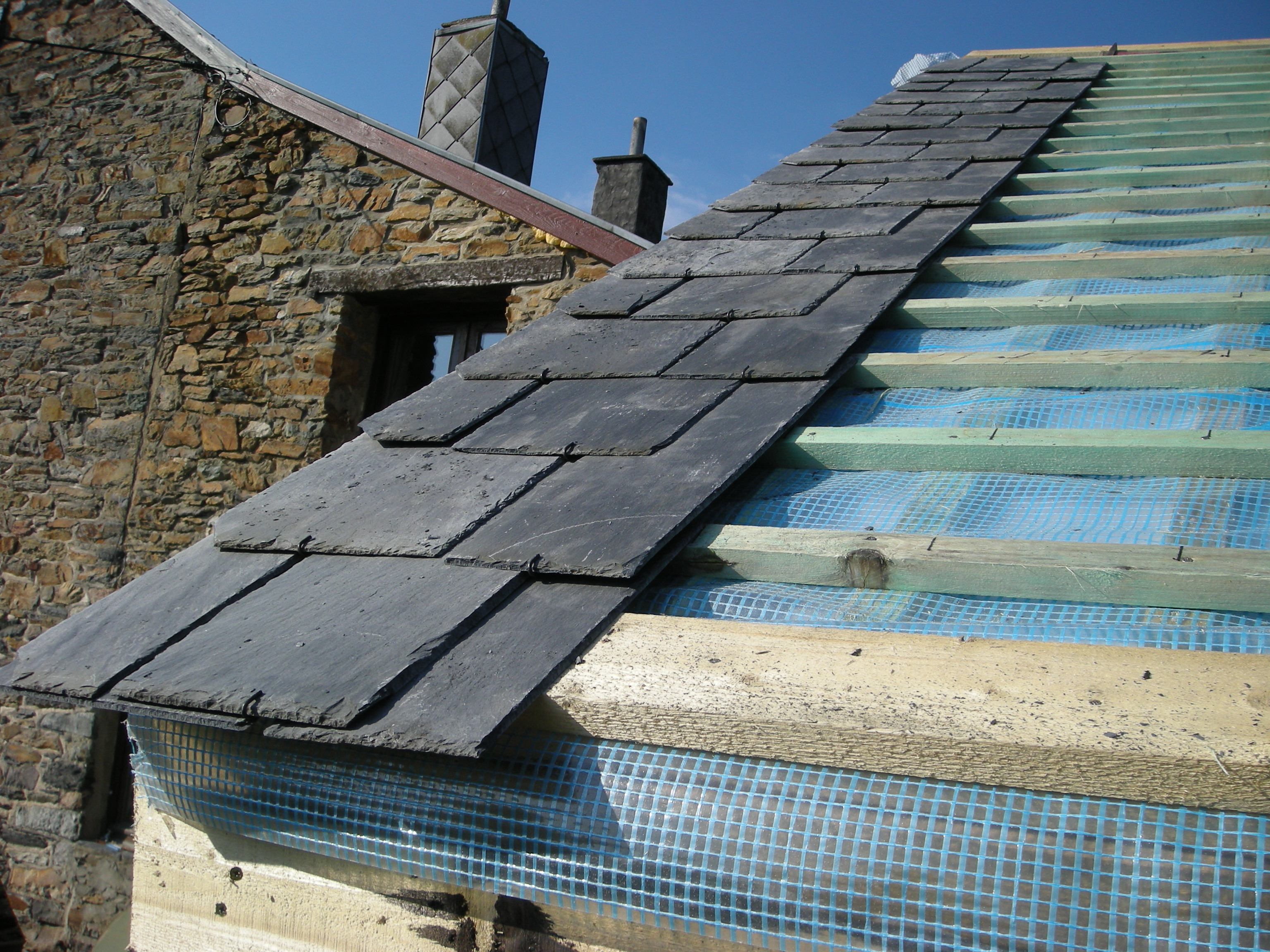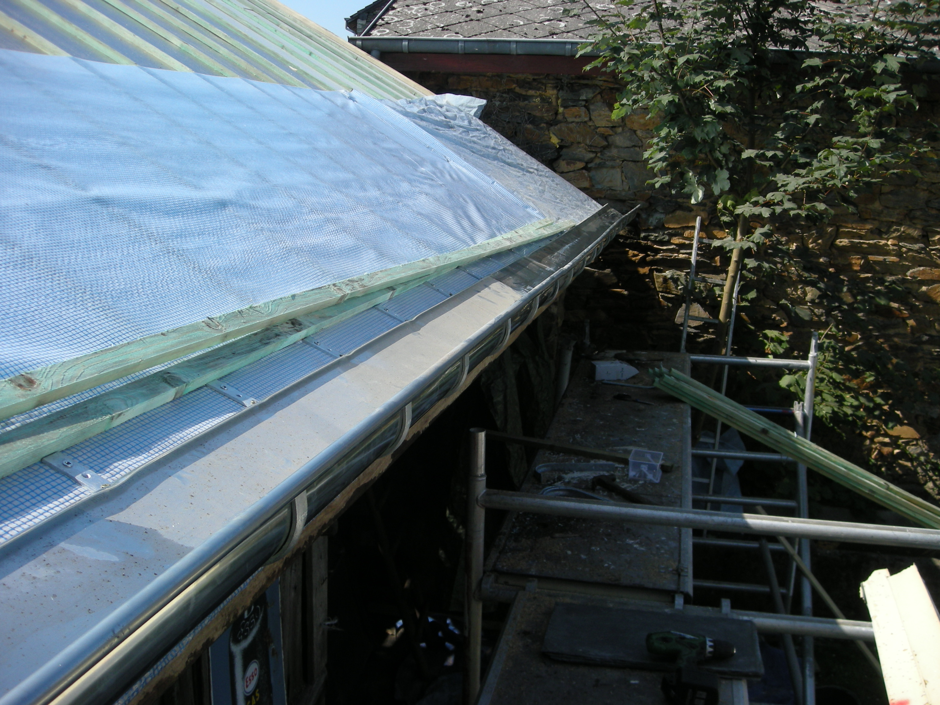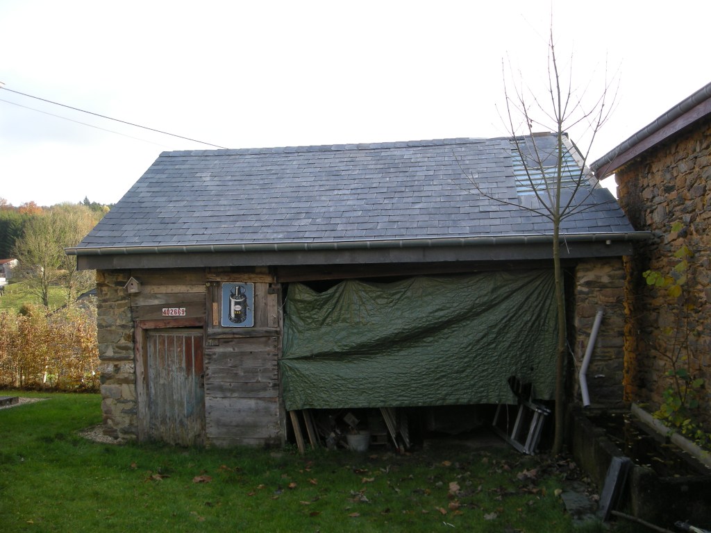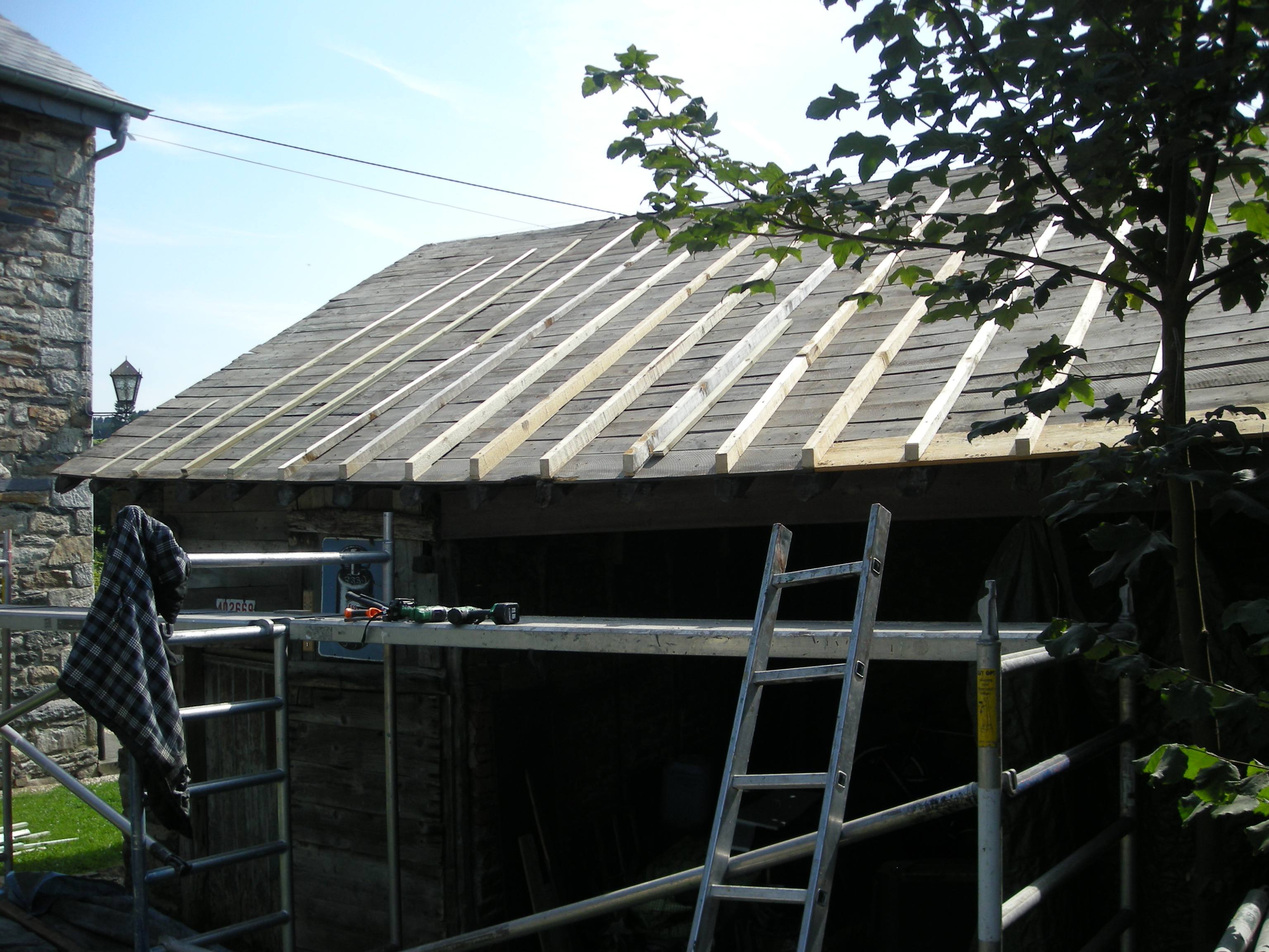 In de nazomer van 2009 zijn we van start gegaan met een nieuw dak voor het stenen schuurtje. Op het naar schatting 200 jaar oude dak lagen prachtige dikke handgekapte schubleien. Heel authentiek dus maar helaas begon het einde van de levensduur te naderen en het dakje lekte op diverse plaatsen. We hadden de oude leitjes al een paar keer rechtgelegd mar de spijkers waren verroest en veel leien gebroken. Helaas werd ook het hout hierdoor aangetast en zat er niet veel anders op dan een nieuw dak te gaan maken.