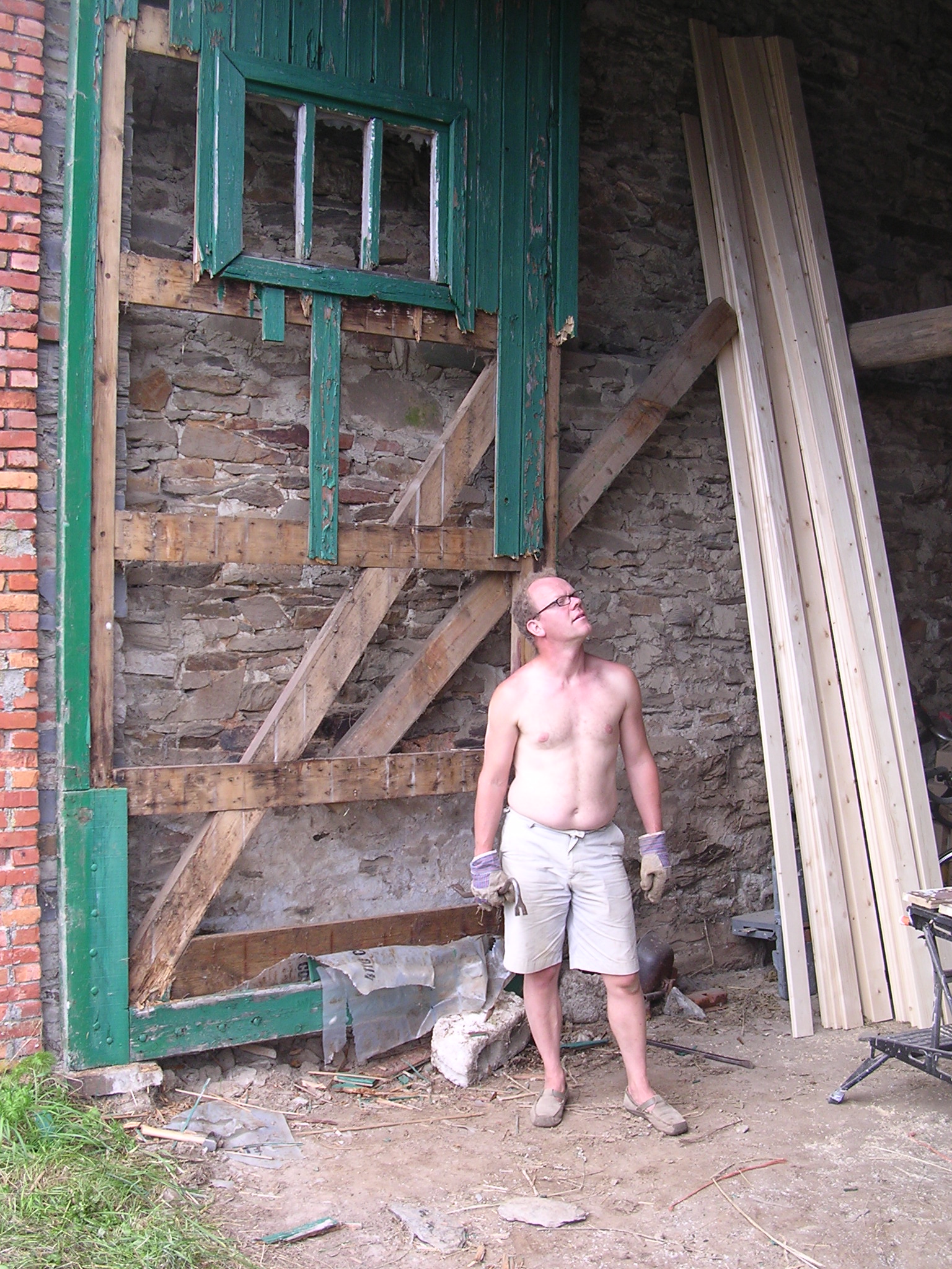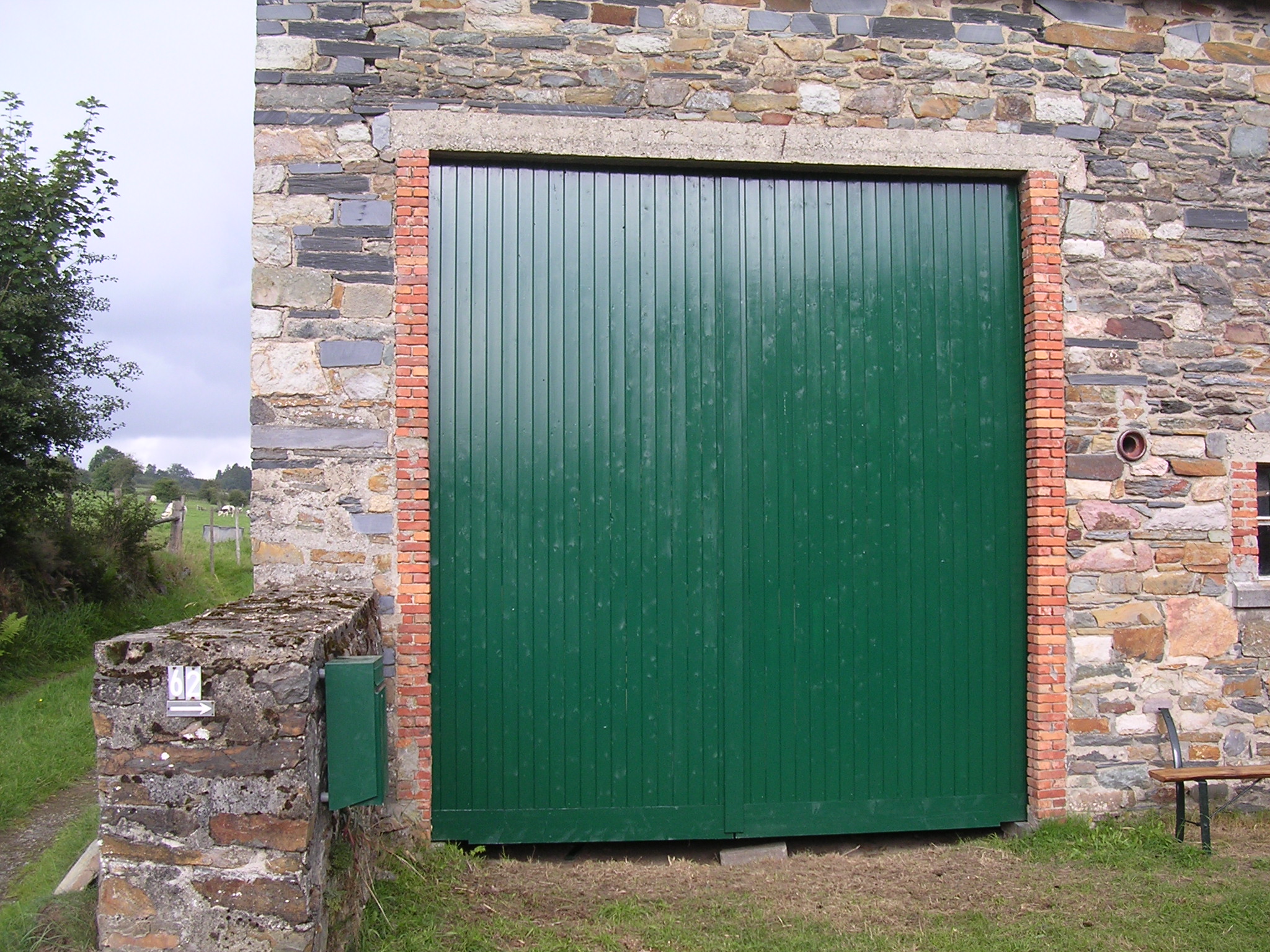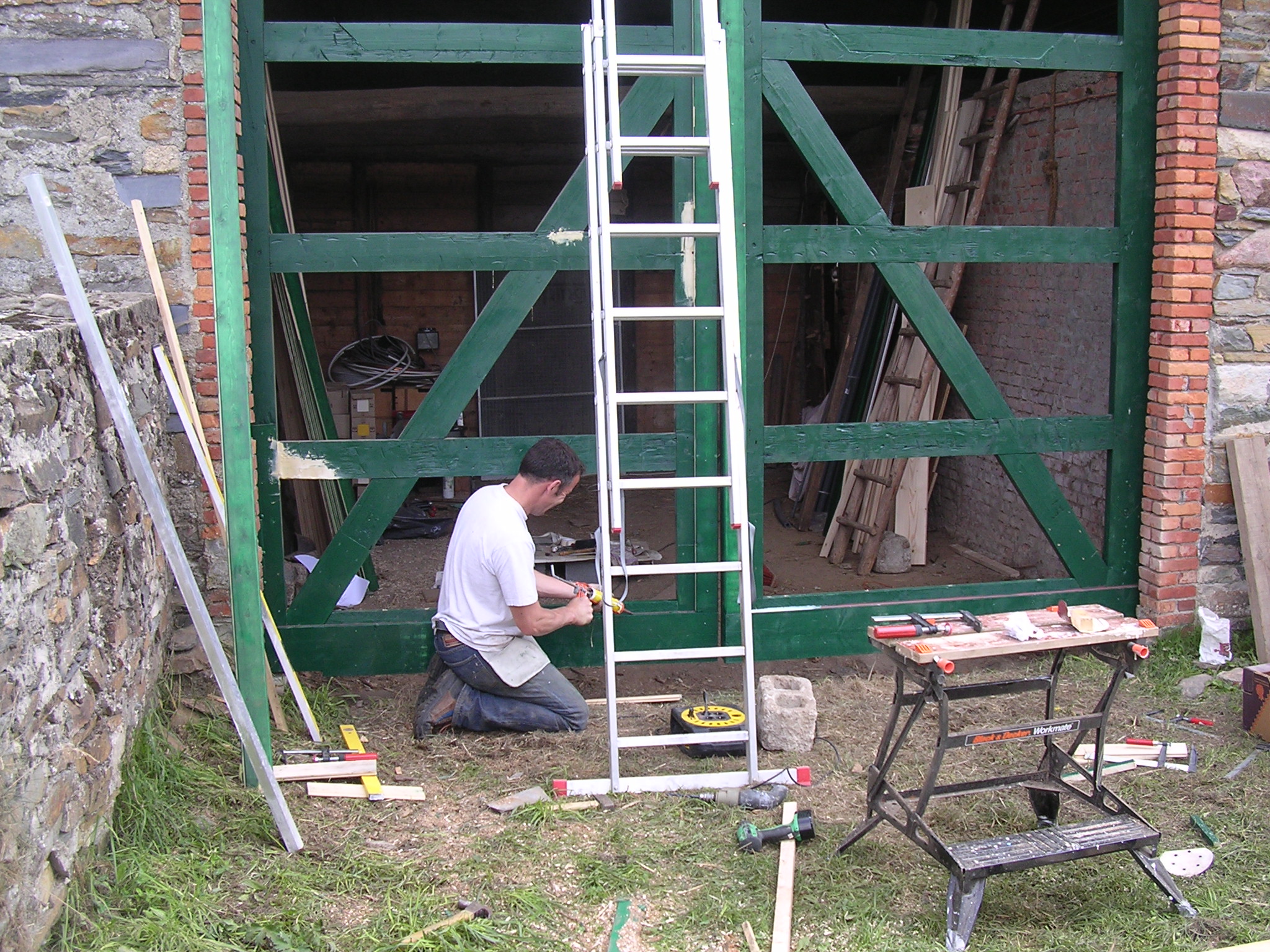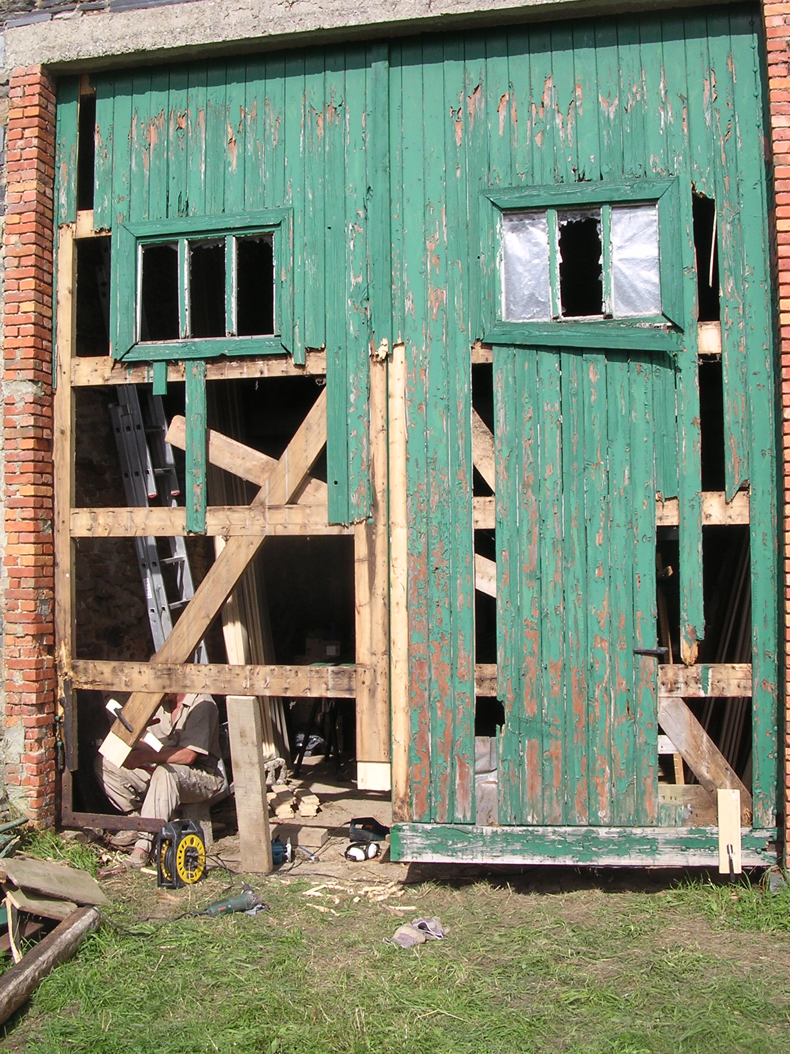 De grote groene staldeuren waren compleet vergaan. Ook het frame bleek bij nadere inspectie aan de onderkant verrot te zijn. We hebben het frame niet uit de scharnieren gehaald omdat we bang waren dat we het nooit meer goed op z’n plek zouden kunnen krijgen. Met verlijmde planken hebben we (vooral Thomas) de constructie weer versterkt en de rotte plekken vervangen. Daarna hebben we het hele zaakje geverfd en van nieuwe planken voorzien. Later zijn er weer raampjes ingemaakt.