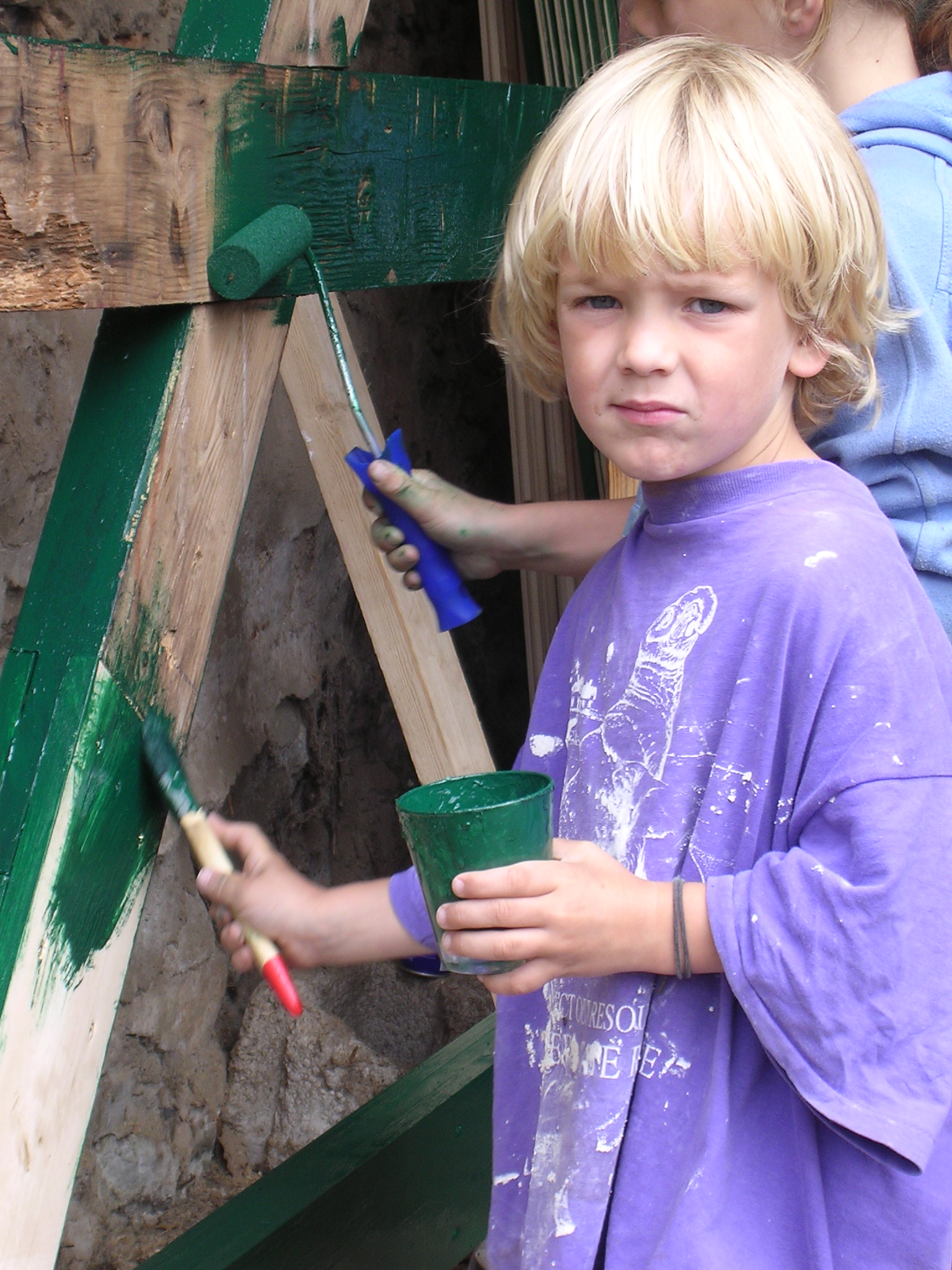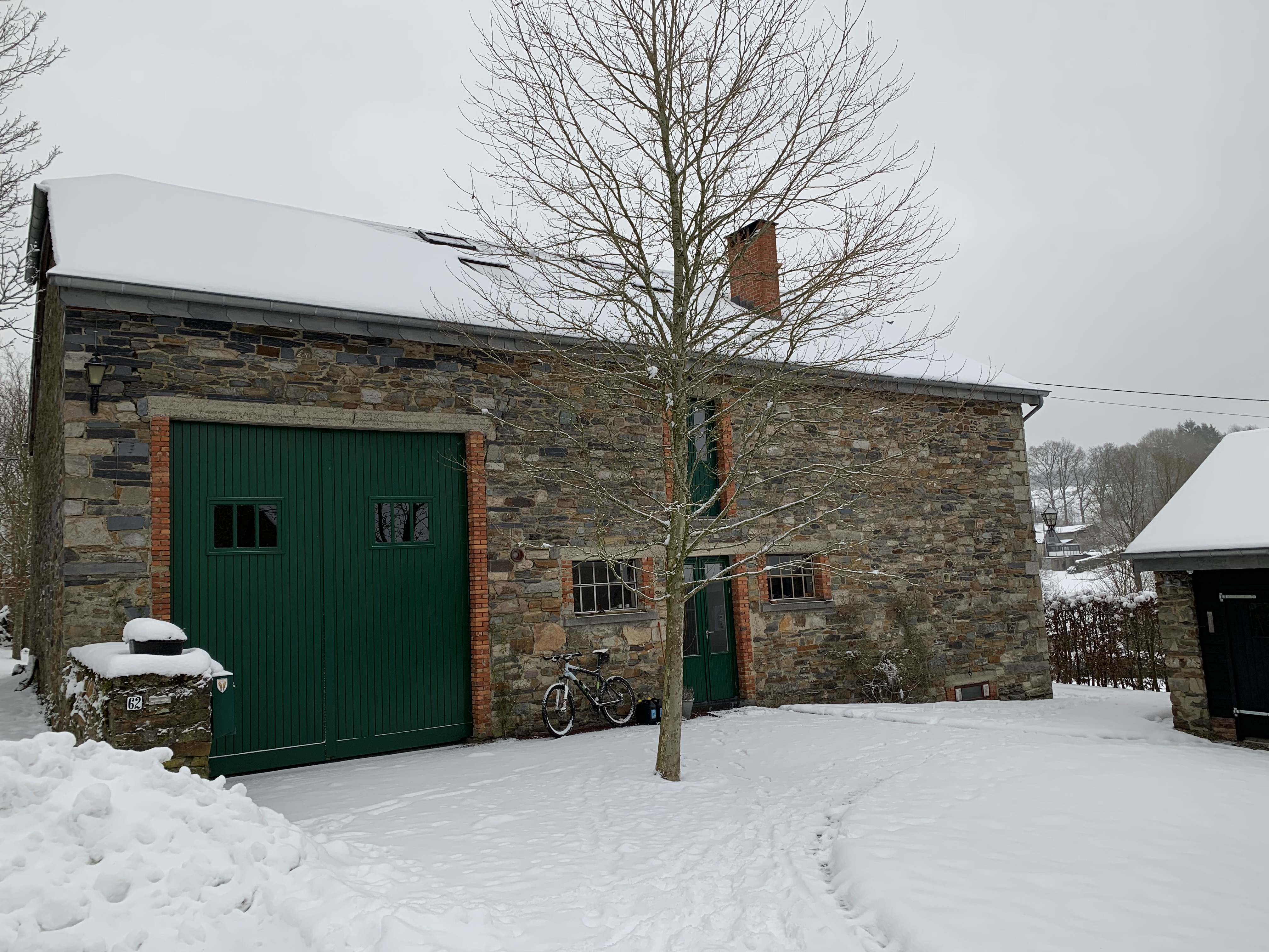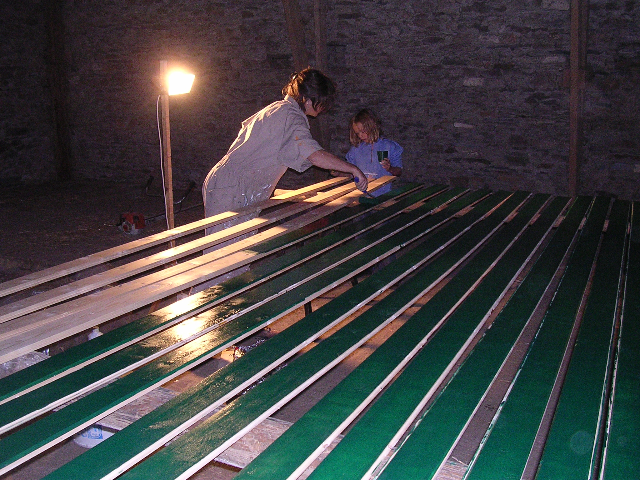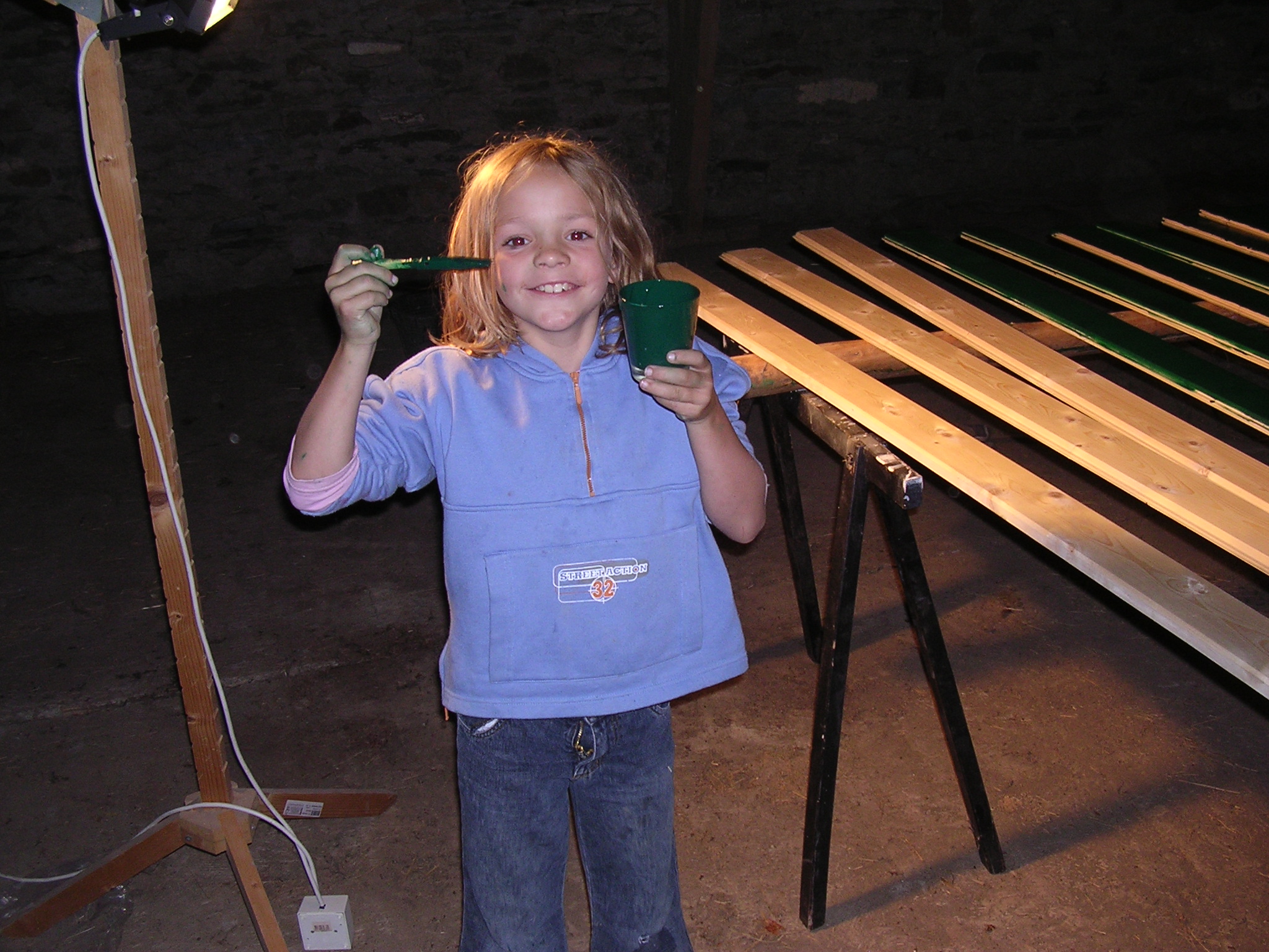 De grote groene staldeuren waren compleet vergaan. Ook het frame bleek bij nadere inspectie aan de onderkant verrot te zijn. We hebben het frame niet uit de scharnieren gehaald omdat we bang waren dat we het nooit meer goed op z’n plek zouden kunnen krijgen. Met verlijmde planken hebben we (vooral Thomas) de constructie weer versterkt en de rotte plekken vervangen. Daarna hebben we het hele zaakje geverfd en van nieuwe planken voorzien. Later zijn er weer raampjes ingemaakt.